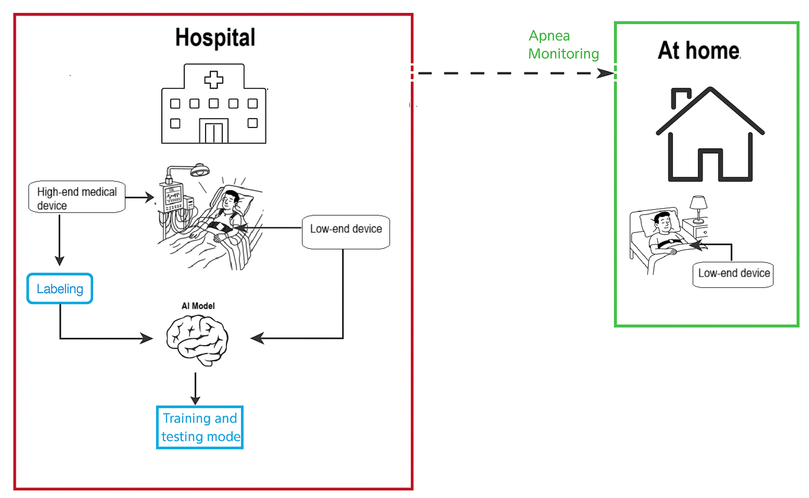 The process begins within the hospital environment, where sleep-related physiological signals are recorded using high-precision medical devices, specifically an ECG. The ECG provides a clinically validated reference for detecting apnea events and serves as the gold-standard supervisory signal for subsequent analyses. Simultaneously, patients are equipped with low-cost devices, such as a BCG belt, capable of capturing indirect signals associated with cardiac and respiratory activity. Through synchronized monitoring, the data collected by the low-cost device can be temporally aligned with the ECG recordings, which are one of the signals recorded in the PSG, along with corresponding clinical annotations. This alignment enables the automatic labeling of low-cost BCG signals using the ECG as a supervisory reference to generate pseudo-labels, allowing the weakly supervised training of non-invasive and easily accessible monitoring systems. Subsequently, an artificial intelligence model is trained via supervised learning to recognize apnea-relevant patterns, using clinically validated annotations from the high-precision medical device as the gold standard.