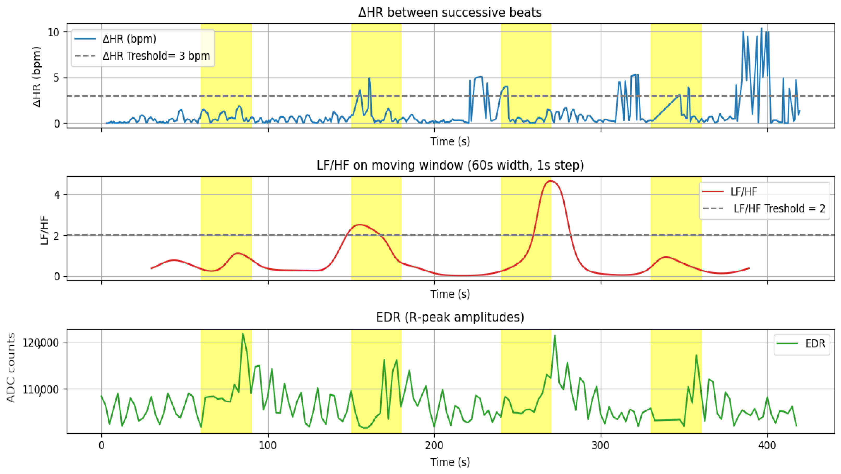 Two complementary strategies were evaluated: (i) peak-based detection on DHR and EDR using a global amplitude threshold to mark transient HR accelerations, and to capture respiration-related envelopes, and (ii) sustained-elevation detection on LF/HF using a threshold plus a minimum duration to model gradual autonomic activation during apneic episodes. To reduce false positives in peak-based methods, a “min-peaks in window” criterion was added, requiring at least N peaks above threshold within W seconds to promote temporally coherent bursts over isolated excursions that often reflect noise or single ectopic beats.