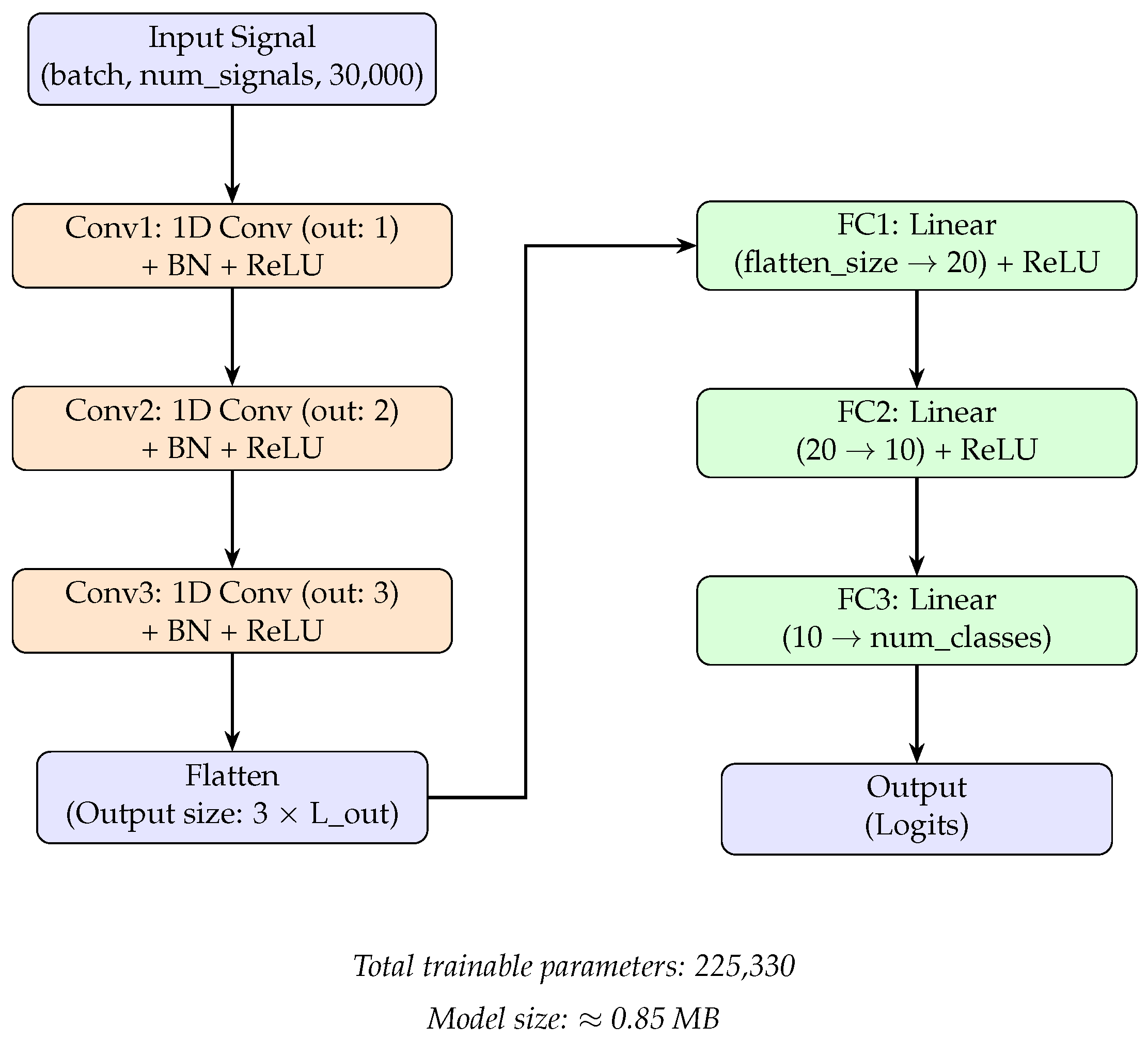 The architecture begins with an input layer that receives the raw one-dimensional signal. This is followed by three successive convolutional blocks Conv1–Conv3. Each block consists of a 1D convolutional layer with a kernel size of 3, a stride of 2, and padding of 1, followed by batch normalization (BN) and a ReLU activation function. Unlike traditional deep models, this architecture utilizes a minimal number of filters—increasing from 1 to 3 across the blocks—effectively reducing the computational footprint while capturing essential temporal patterns through strided convolutions.
