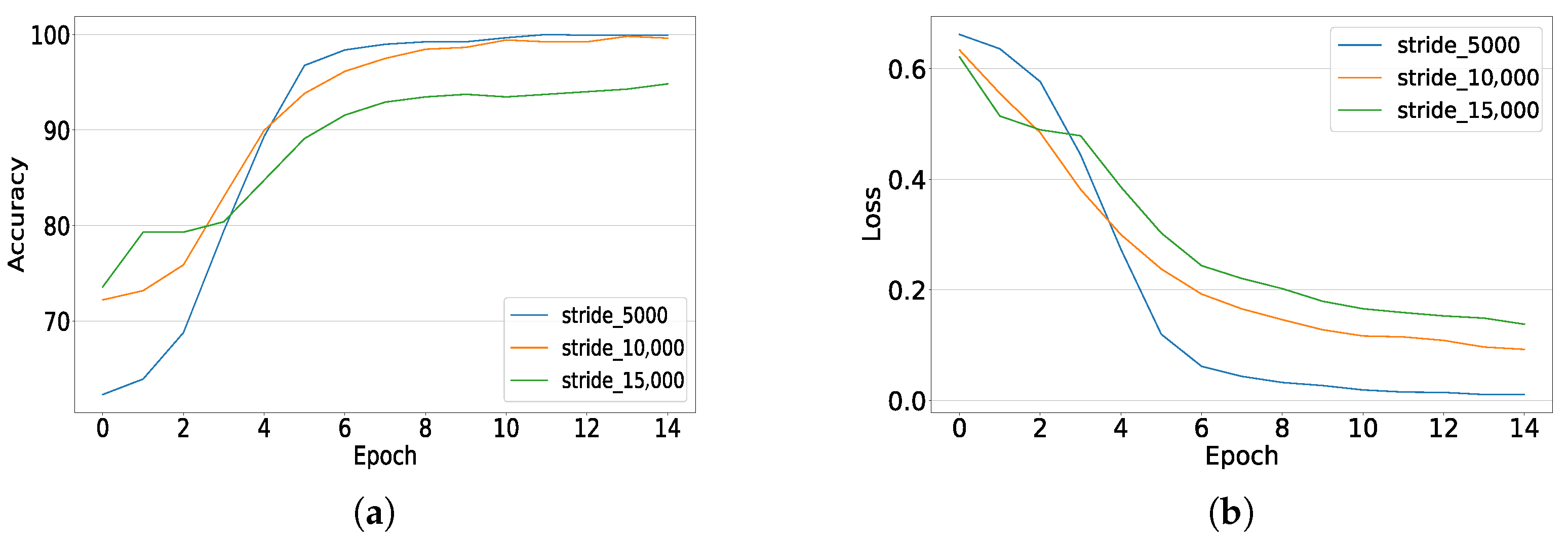 Table 4, where the highest accuracy and lowest loss are obtained when both training and testing are performed with 15,000-stride windows. Furthermore, when training and inference are performed on different datasets, the model trained with 15,000-stride windows generally achieves superior performance compared to the 10,000- and 5000-stride configurations, while the 5000-stride model consistently demonstrates inferior accuracy and highest loss values.