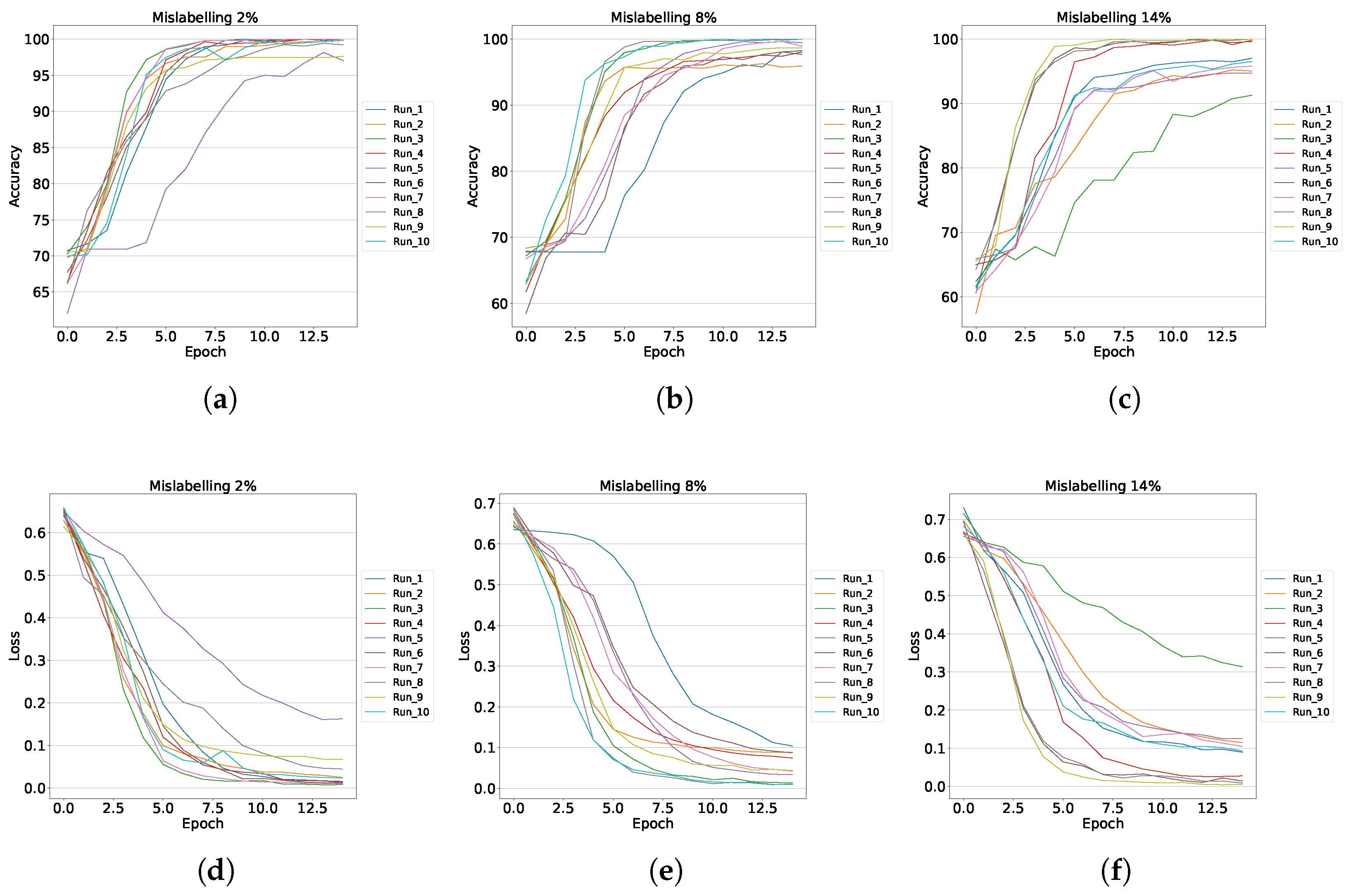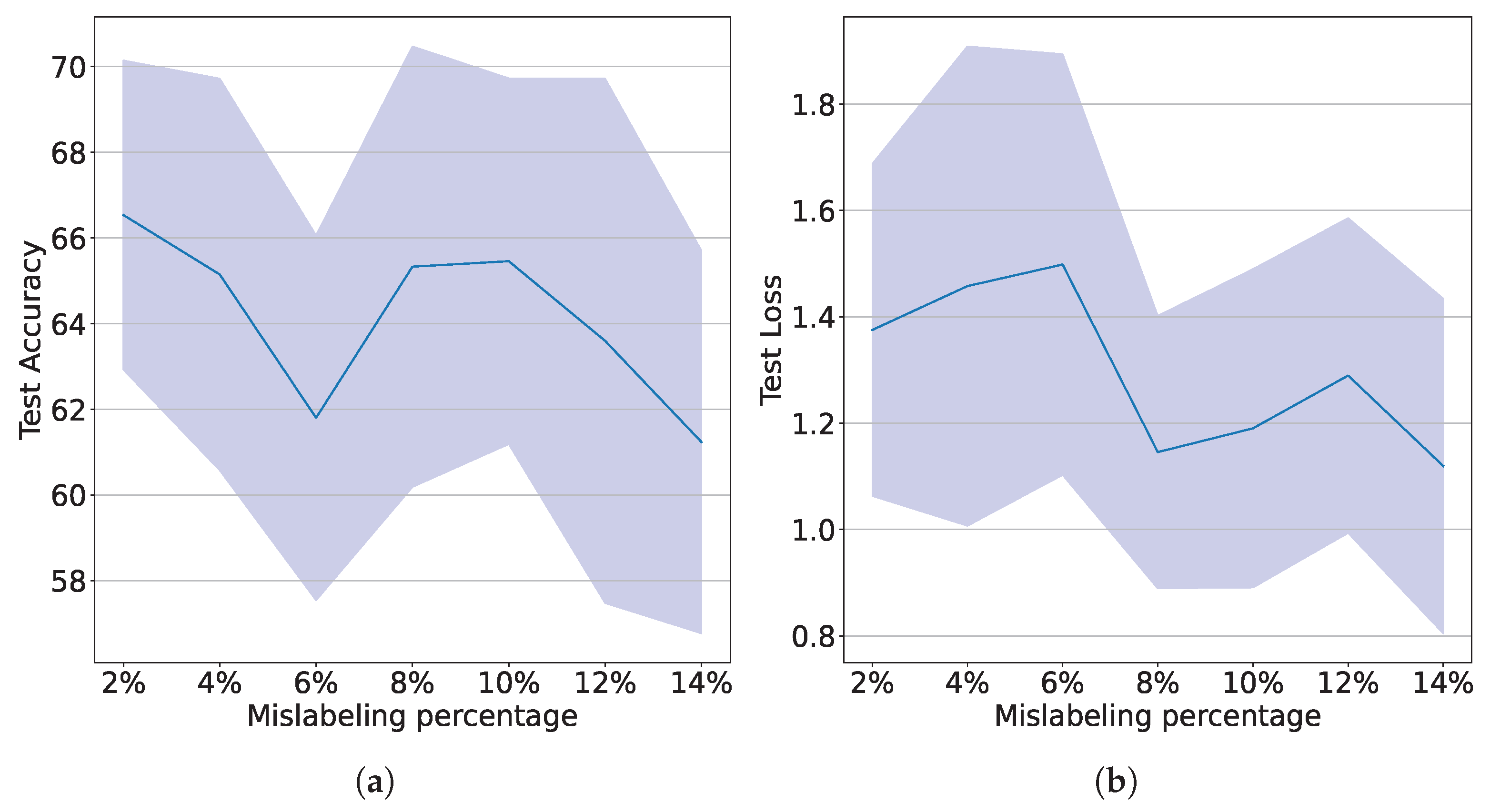 Figure 8, it is shown how the test accuracy decreases when the mislabeling rate increases. Average and deviation is computed over 10 runs for each percentage value of the mislabeling rate.