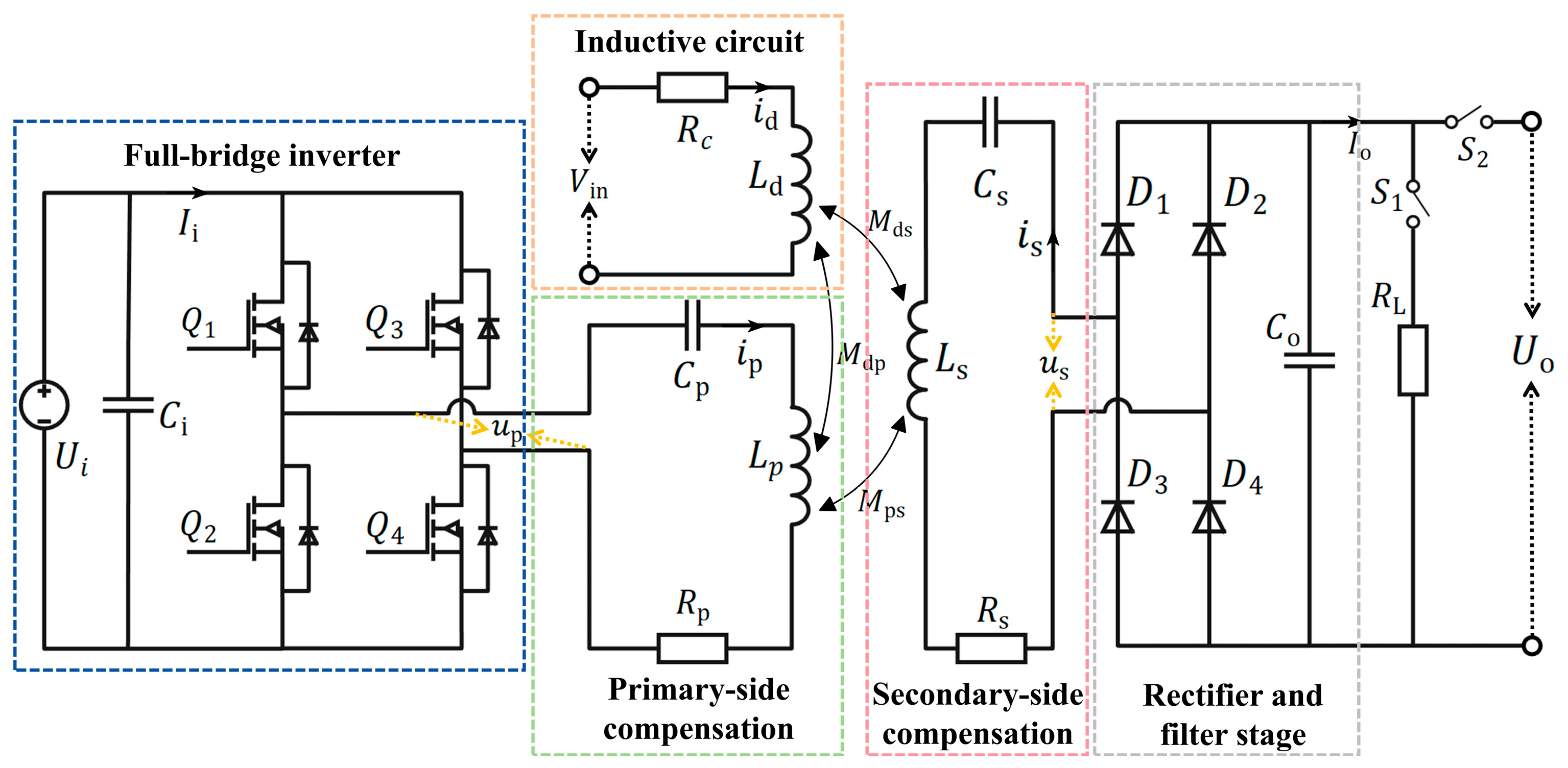 The system’s primary side comprises the DC input voltage (Ui), the bus capacitance (Ci), and a full-bridge inverter composed of power switches Q1Q4. The primary compensation branch comprises compensation capacitance ( C p ), transmitter coil self-inductance ( L p ), and its equivalent resistance ( R p ). This configuration achieves near-resonance at the operating frequency, thereby establishing a stable alternating magnetic field around the transmitter coil.