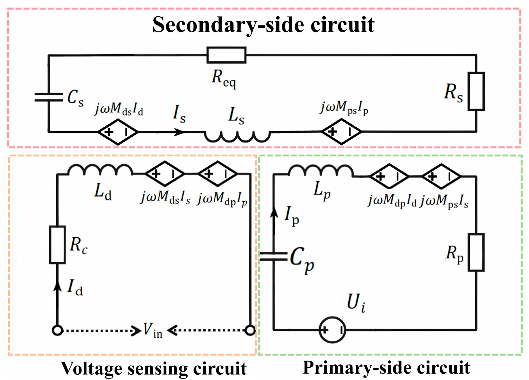 Due to the frequency-selective characteristic of the S–S resonant network in the wireless charging system, energy transfer is mainly concentrated at the fundamental frequency, while higher-order harmonic currents are suppressed. Therefore, the following analysis in this paper considers only the fundamental components of voltage and current. Figure 2 illustrates the equivalent circuit, which includes the primary-side loop, secondary-side loop, and voltage detection loop.