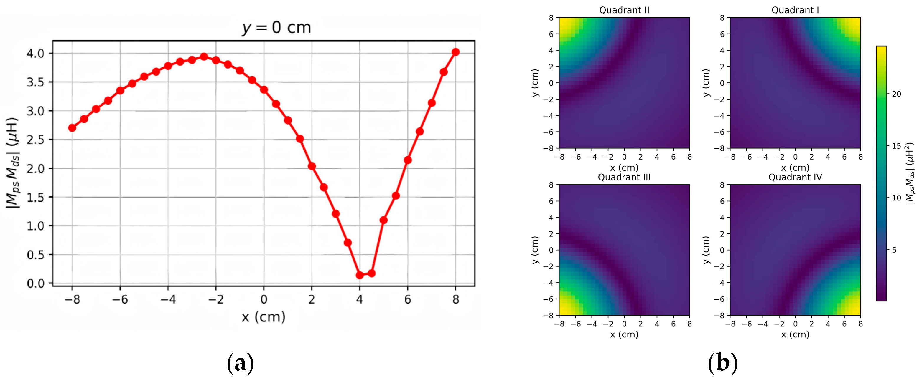Figure 4. Spatial distribution and representative cross-sections of the mutual-inductance product feature | M ps M ds |: (a) Variation of | M ps M ds | with offset along a representative path; (b) Heat map of | M ps ( x , y ) M ds x , y | in the x–y plane.