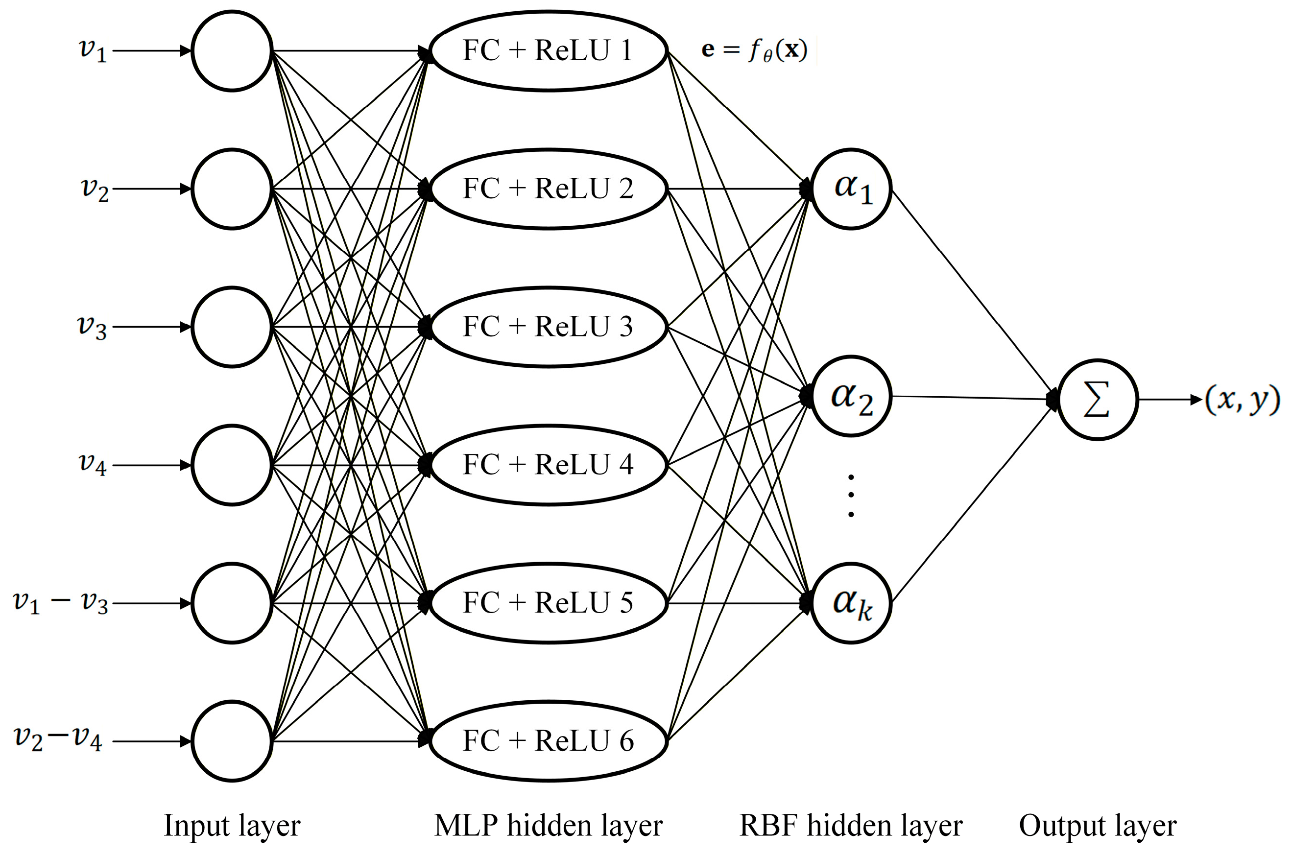 This network consists of a front-end feature embedding module and a back-end RBF-weighted regression module. For the input six-dimensional voltage feature vector x R 6 , a multi-layer perceptron containing six hidden layers with a total of 432 neurons is applied for non-linear mapping, so that a discriminative embedding is yielded: