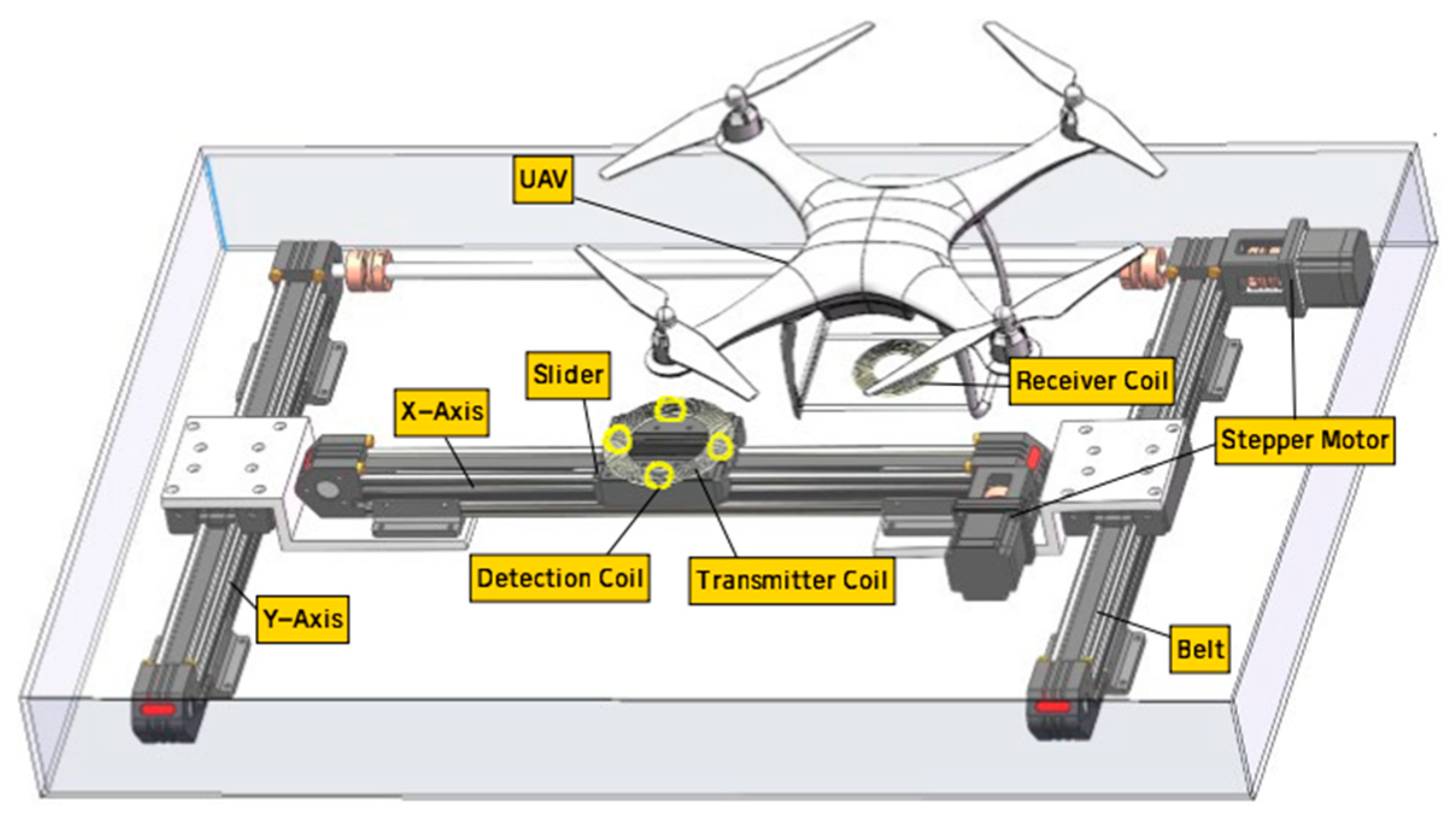 In the practical scenario, after the UAV lands stably on the flat platform, the air gap is constrained by the UAV’s height and platform structure, keeping a fixed axial gap. The UAV’s circular receiver coil is mounted parallel to the charging platform, so angular misalignment is ignored. The platform moves in 2D with stepper motors. If there are variations in coil height, orientation, or air gap, they can be solved by re-sampling the fingerprint database.