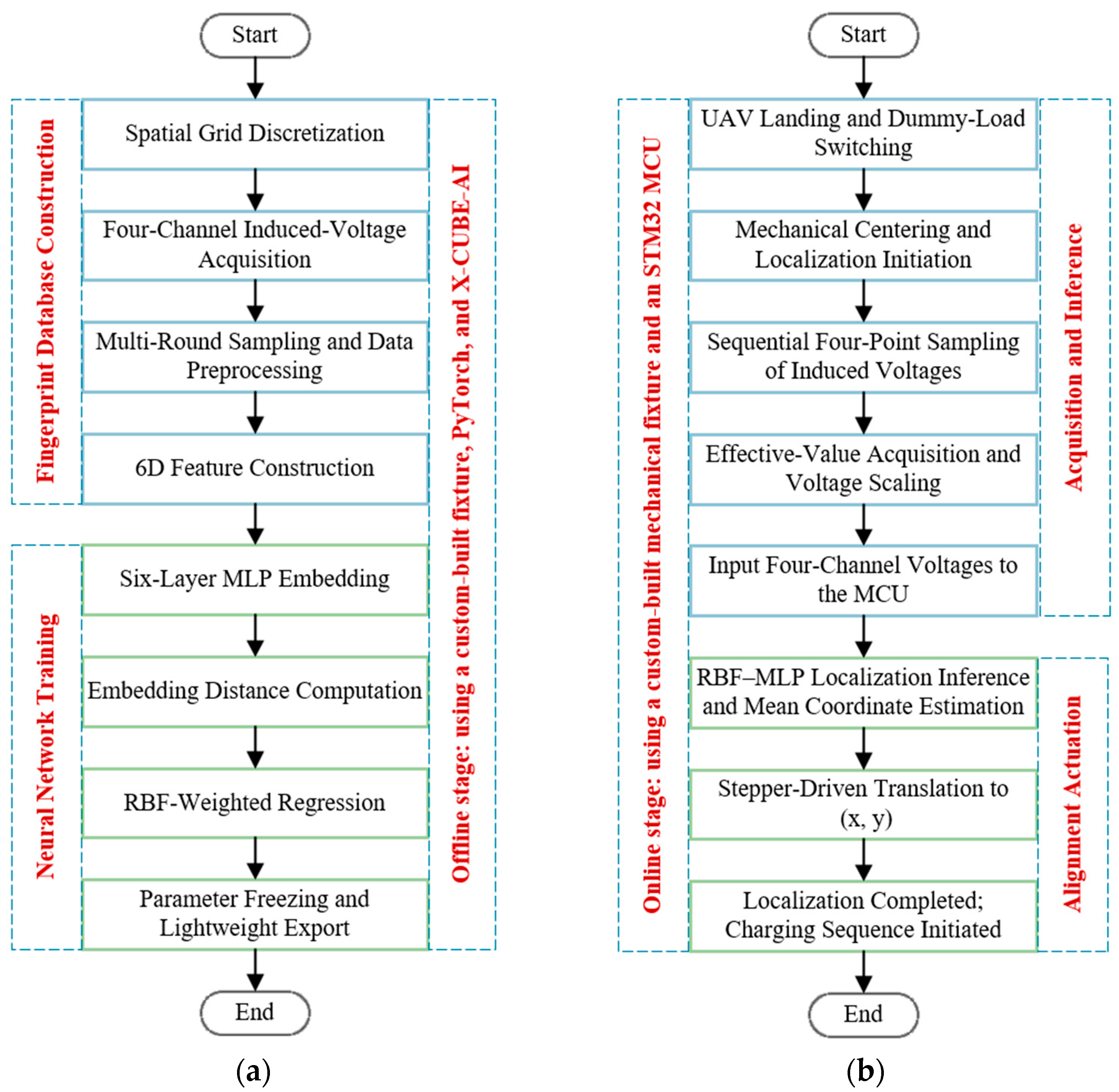 The principal work and contributions of this study are summarized as follows: (1) a BP-decoupled symmetrical detection coil structure suitable for UAV wireless charging scenarios is proposed, which enhances positional feature identifiability by extracting positional characteristics from induced voltage signals; (2) a lightweight regression positioning model utilizing voltage fingerprints is constructed, so that the neural network learns the mapping relationship between voltage fingerprints and position through MLP regression and RBF weighting, thereby achieving high-precision positioning and alignment, and providing online inference workflow tailored for embedded platforms; (3) a prototype and experimental platform is established to validate positioning accuracy and alignment performance, which demonstrates that the method possesses strong engineering applicability and feasibility without modifying the UAV receiver.