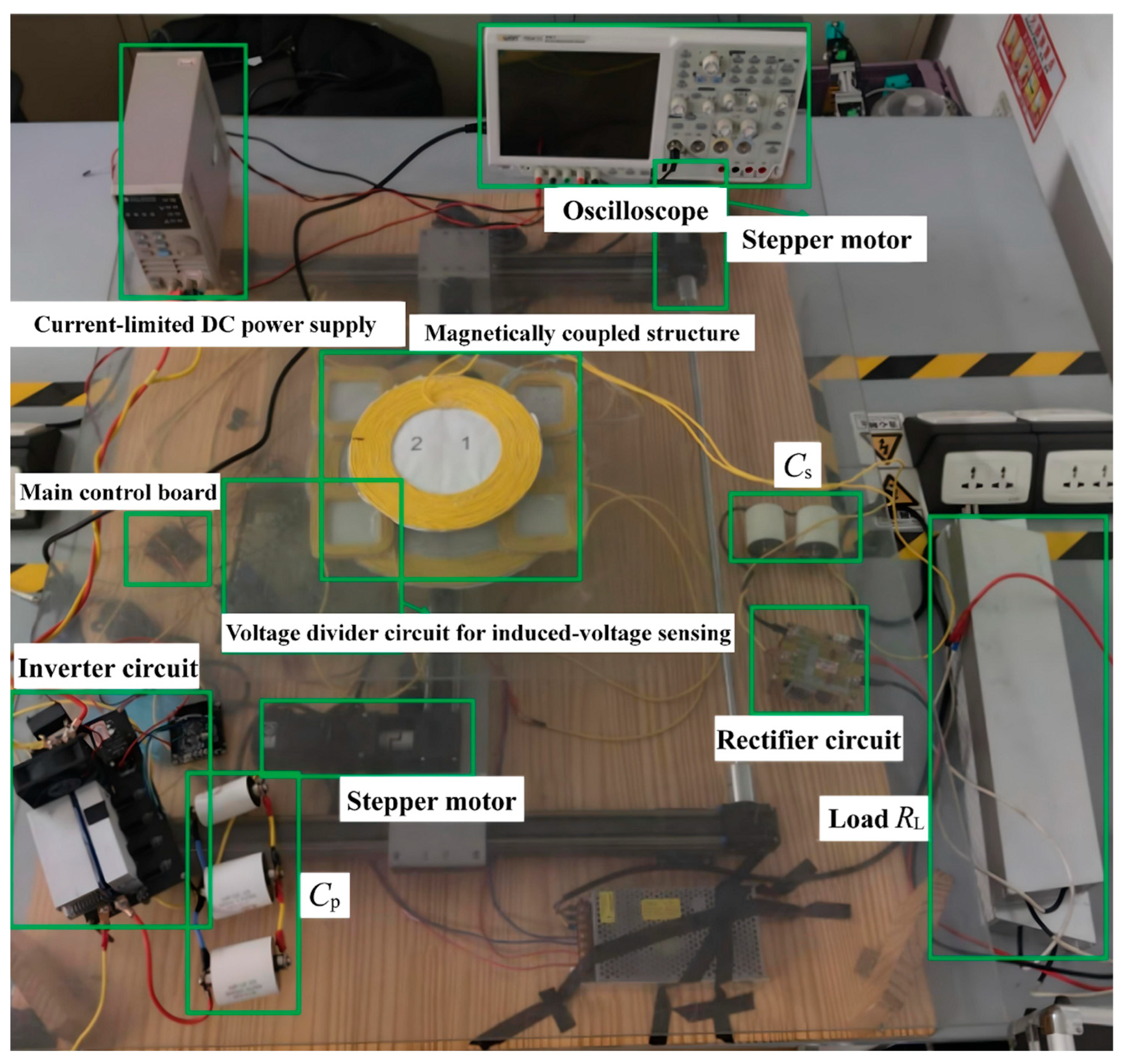 To validate the proposed wireless charging alignment method based on detection coil-induced voltage fingerprints and embedded neural network inference, an experimental platform was constructed, as shown in Figure 9. The system mainly consists of a wireless power transfer device, a BP symmetrical detection coil array, an embedded control unit, and a 2D motion platform. The wireless power transfer adopts an S–S compensated topology. The primary inverter drives the transmitter coil, and the secondary side is connected to a fixed load during alignment to reduce the influence of power fluctuations on the detection signals. Notably, due to the S–S topology circuit, a current-limiting DC power source is required to prevent component damage under no-load conditions. In practical UAV application scenarios, the secondary receiving side is not an isolated coil; rather, it can be regarded as an “induced component” jointly formed by the receiving coil and its surrounding structures. Their overall electromagnetic response collectively affects the ultimately measured voltage characteristics. The key system parameters are listed in Table 1.