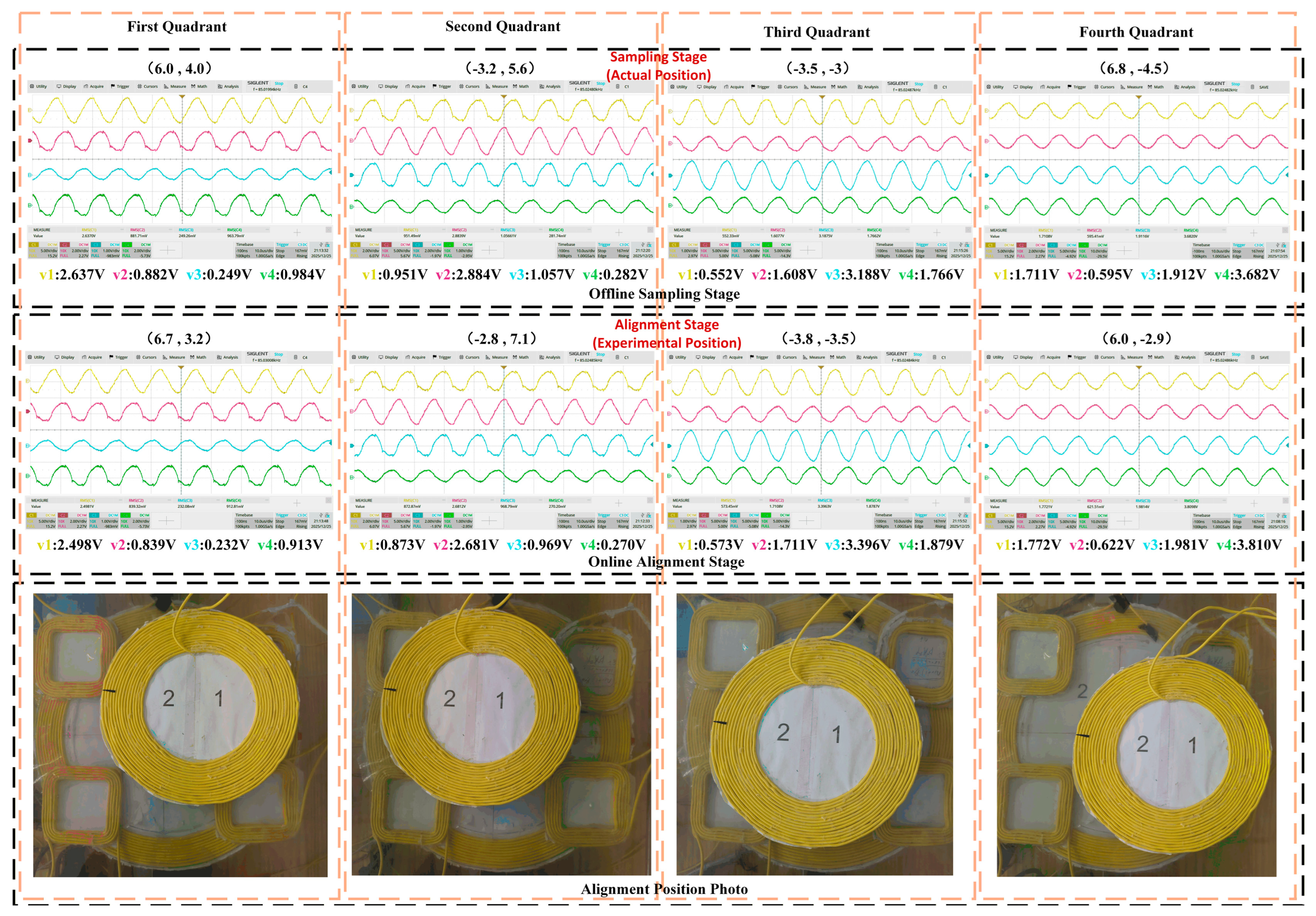 Figure 11. The four quadrants represent the induced voltages and waveforms of the four detection coils during both offline sampling and online alignment processes for positions, together with the actual positions and coordinates of the receiver coil, the image uses color-coded numbers to indicate the effective induced voltage for each corresponding coil.