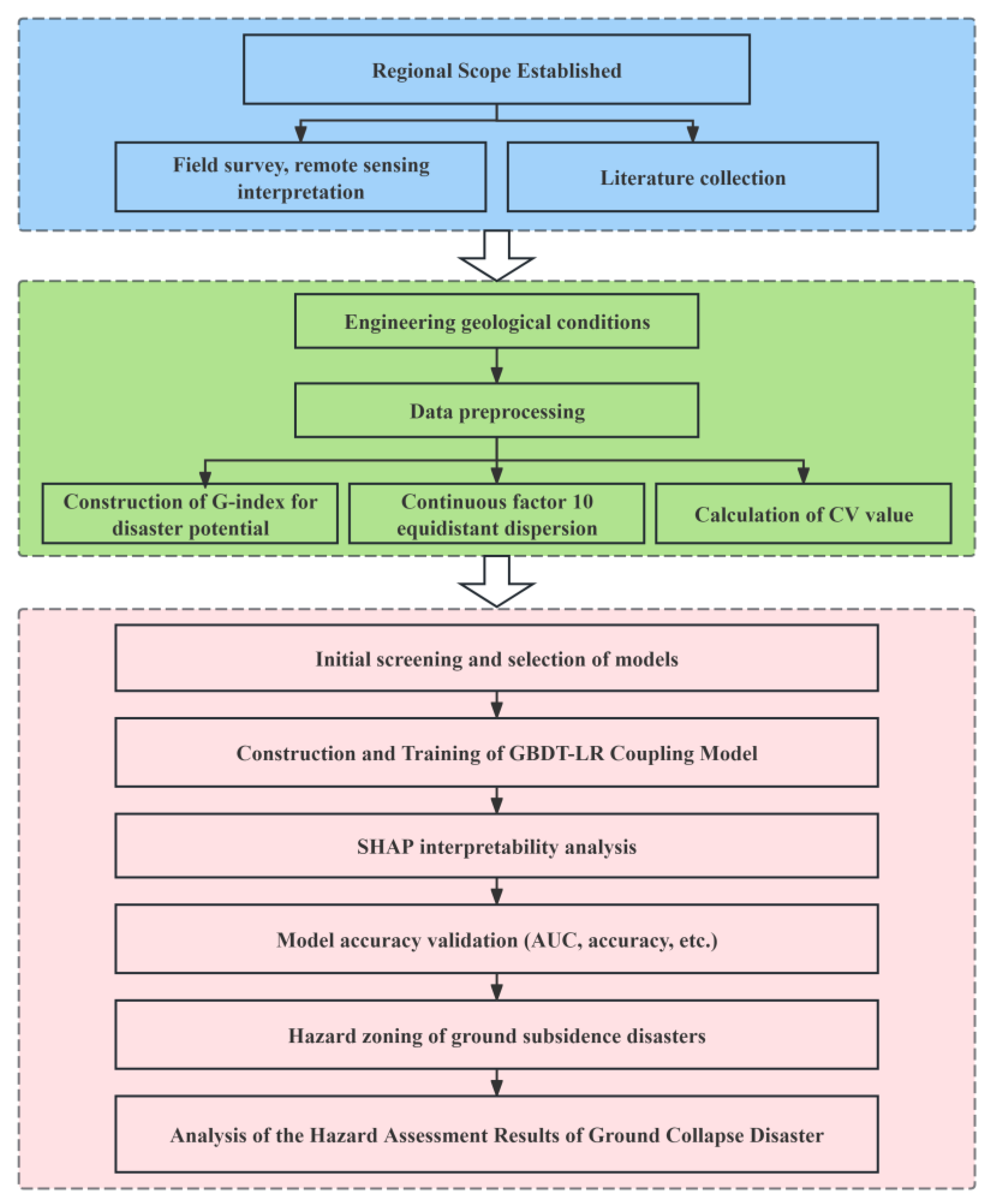 - The GBDT-LR model relies on the aggregate spatial correlation between multiple geographic factors and collapse occurrence, rather than the precise coordinates of individual points. Thus, minor positional errors in a small subset of samples do not alter the identified disaster-causing mechanisms or degrade the model’s predictive performance.