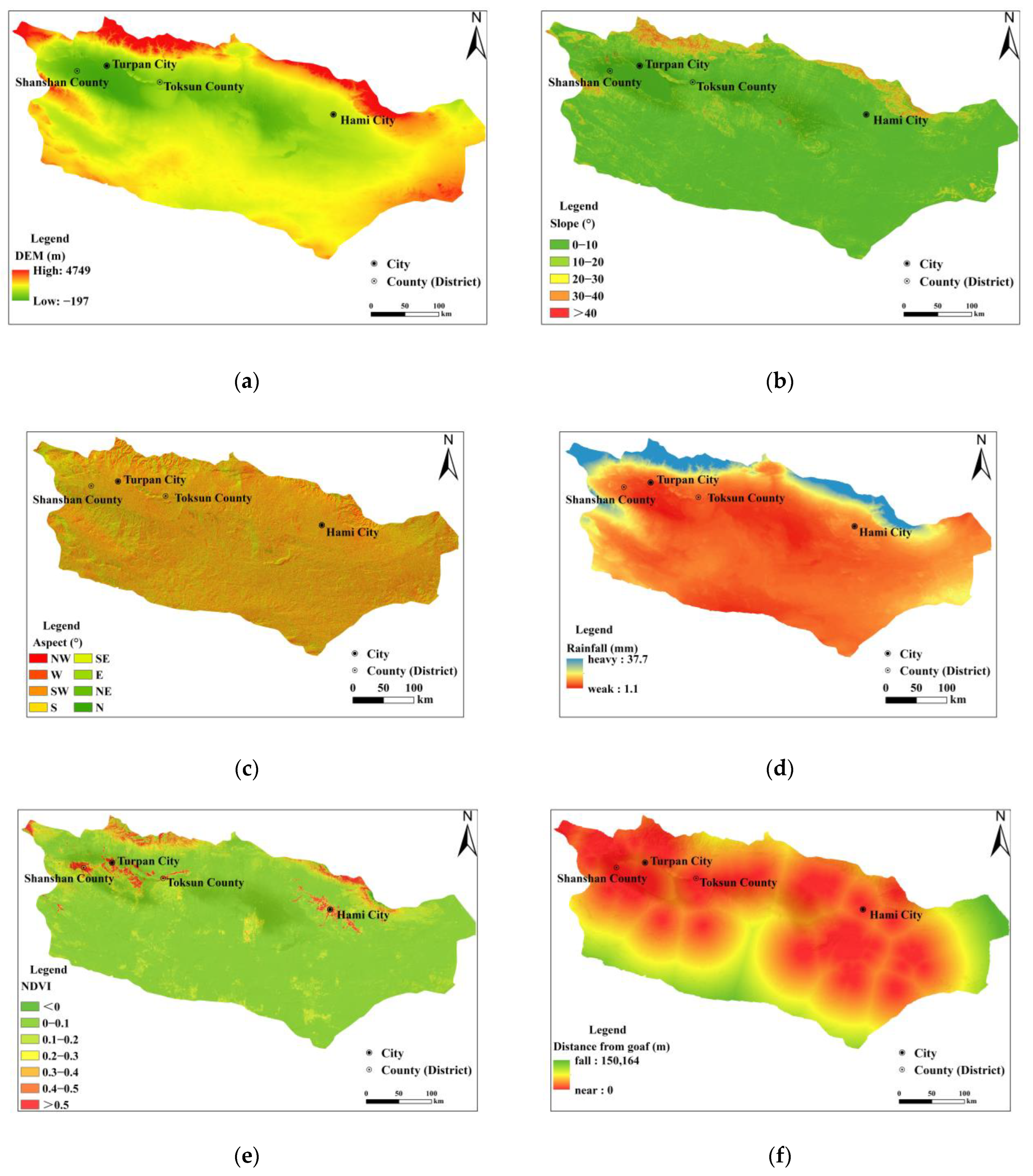 - This study focuses on large-scale spatial distribution patterns and multi-factor coupling mechanisms of ground collapse in the Turpan–Hami Basin (study area ≈ 5.3 × 104 km2), where collapse clusters typically span several square kilometers. Compared with this analytical spatial scale, the ±30 m positional deviation is negligible and will not interfere with the identification of overall distribution laws.