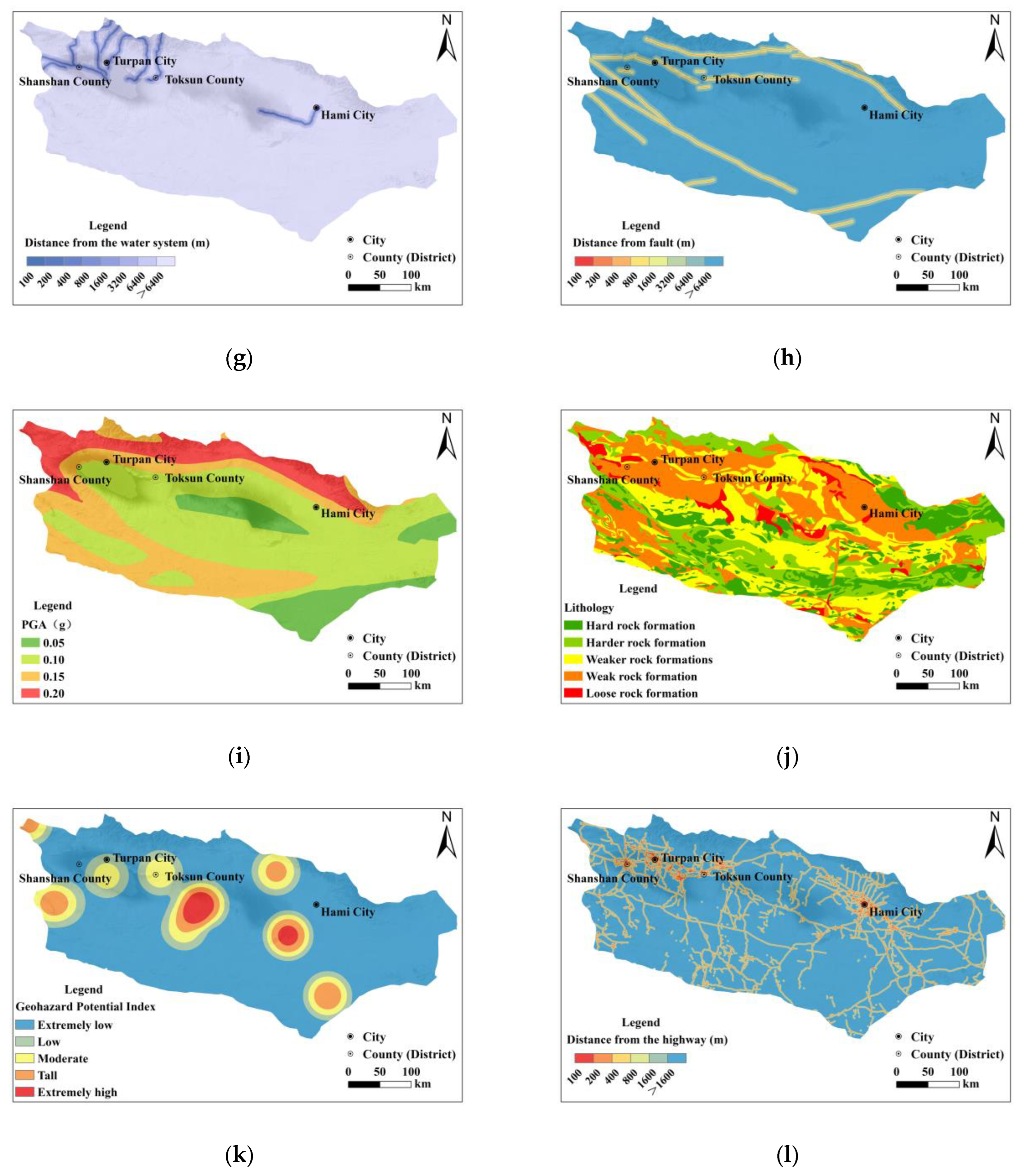 - Niu, L.; Gulibostan, T.; Wang, T.; Feng, Z. Analysis on Distribution Characteristics and Main Controlling Factors of Geological Disasters in Xinjiang. West-China Explor. Eng. 2023, 11, 38–41. (In Chinese) [Google Scholar]
