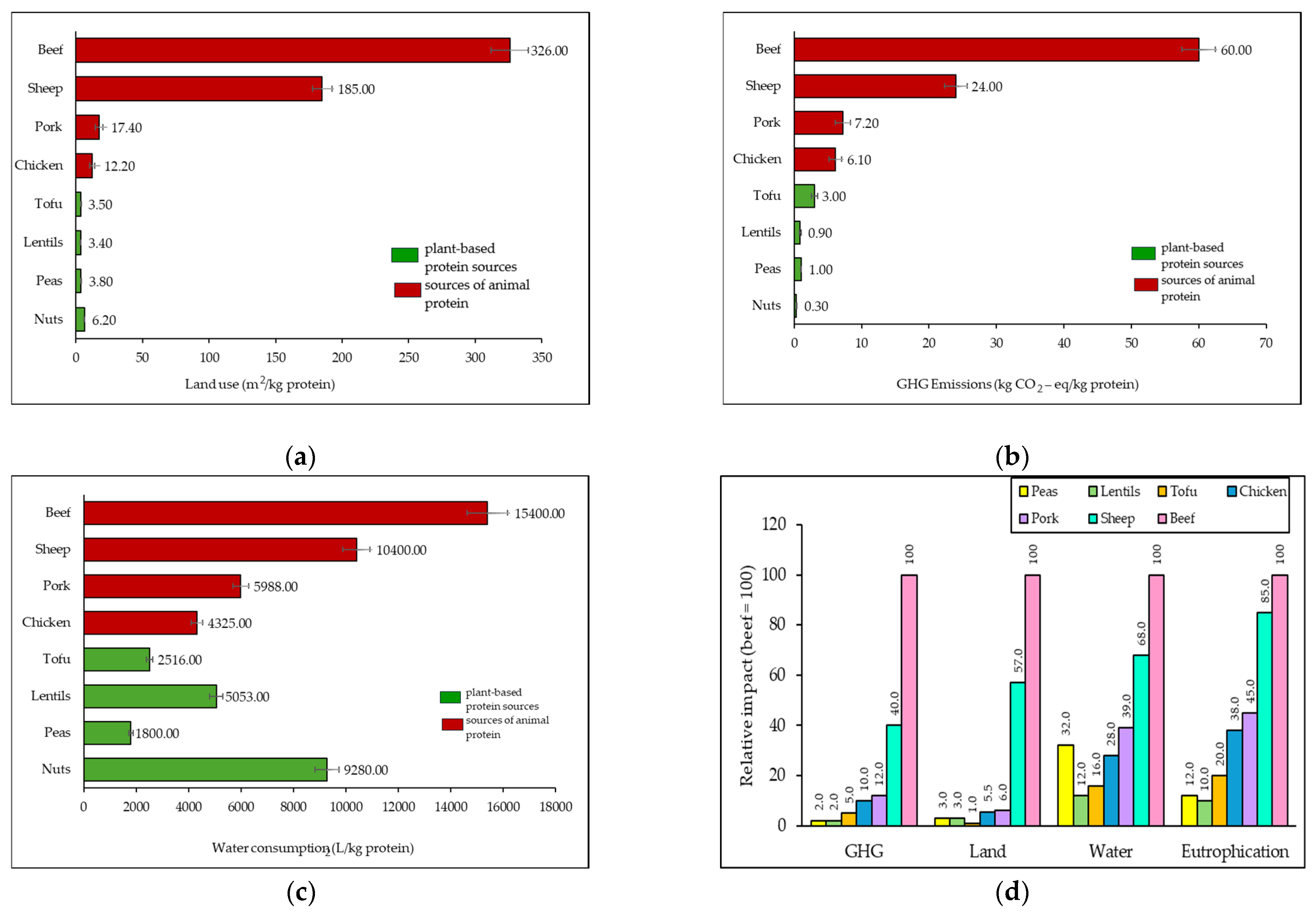 | Protein Source | GHG Emissions (kg CO2-eq/kg Protein) | Land Use (m2/kg Protein) | Water Use (L/kg Protein) | Eutrophication (g PO4-eq/kg) |