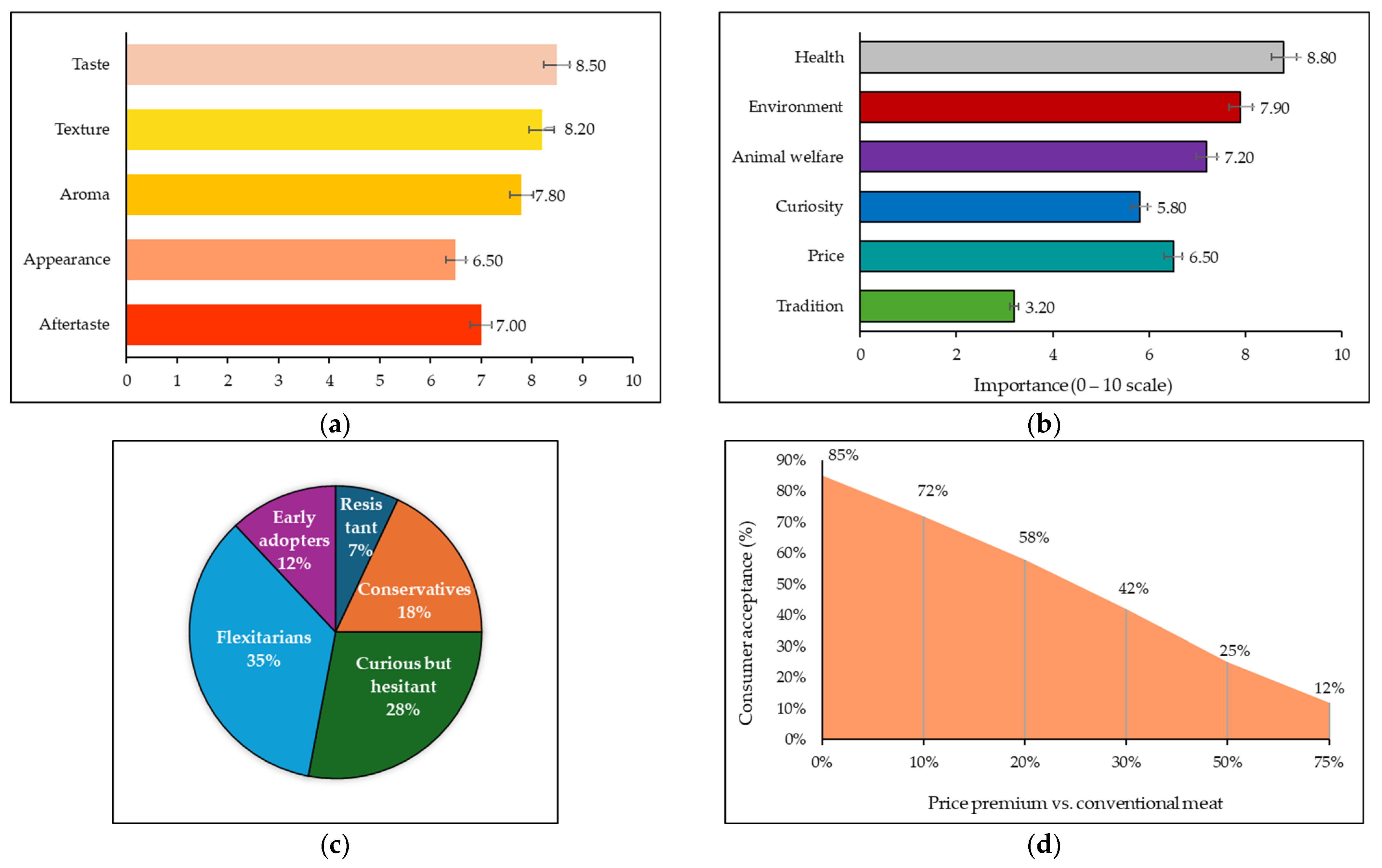 | Economic barriers | Premium price (+20–50%) | 8.8 | 72 | Perceived value for money |