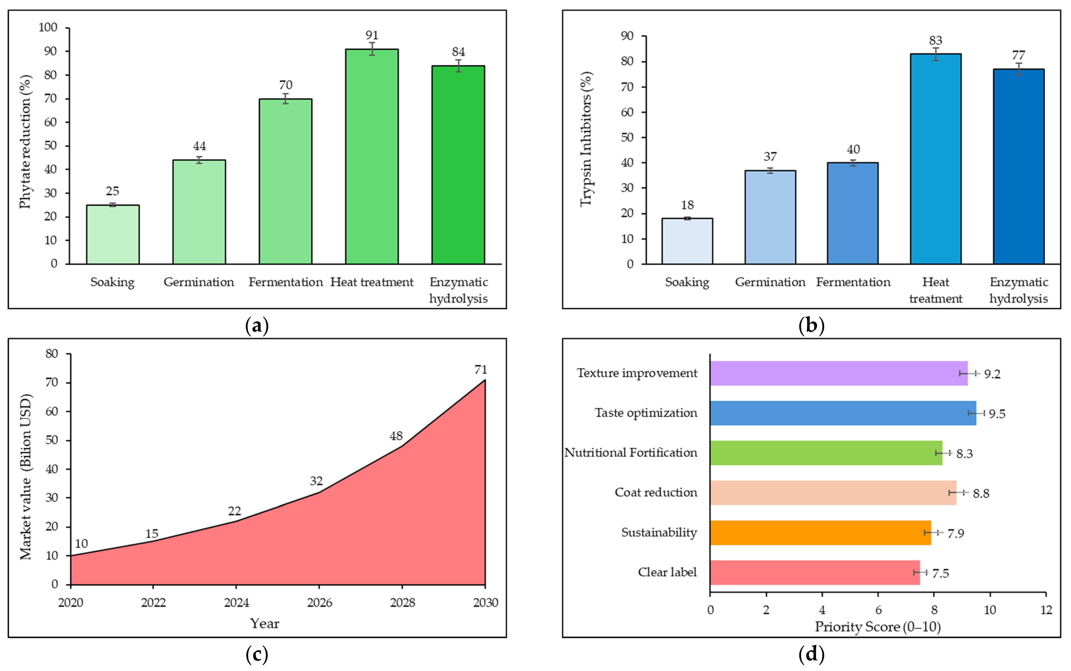 | Saponins | Quinoa, chickpeas, soybeans | Reduces nutrient absorption | 10–20 | 50–65 | 65–80 |