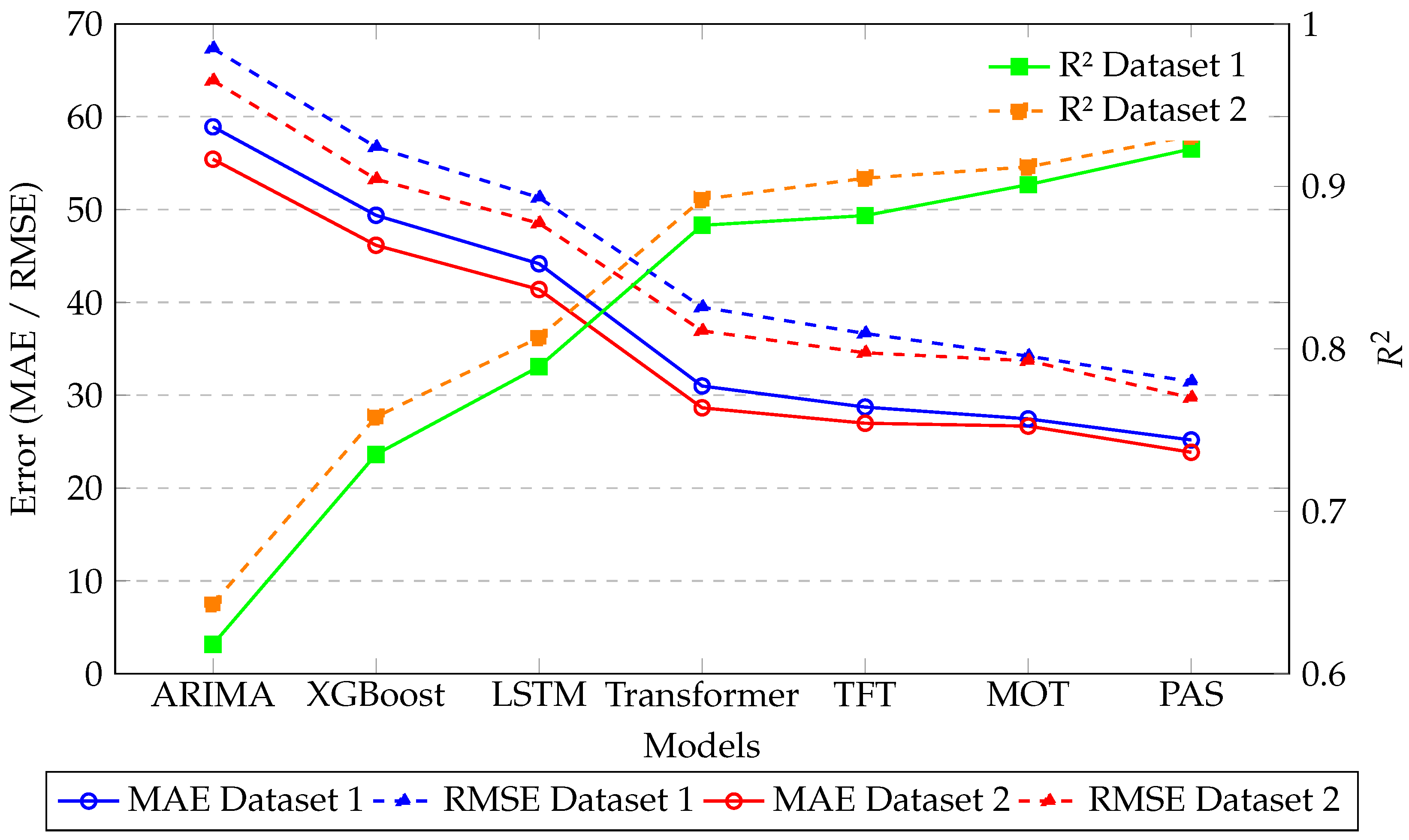 metrics, which represent the explained variance for each model. Solid lines correspond to Dataset 1, and dashed lines correspond to Dataset 2. It can be observed that traditional models such as ARIMA and XGBoost exhibit relatively high MAE and RMSE values, reflecting their limited ability to capture nonlinear demand patterns. Deep learning models, including LSTM and Transformer, reduce errors substantially, while hybrid models like TFT and MOT further improve performance by combining attention mechanisms and metaheuristic optimization.