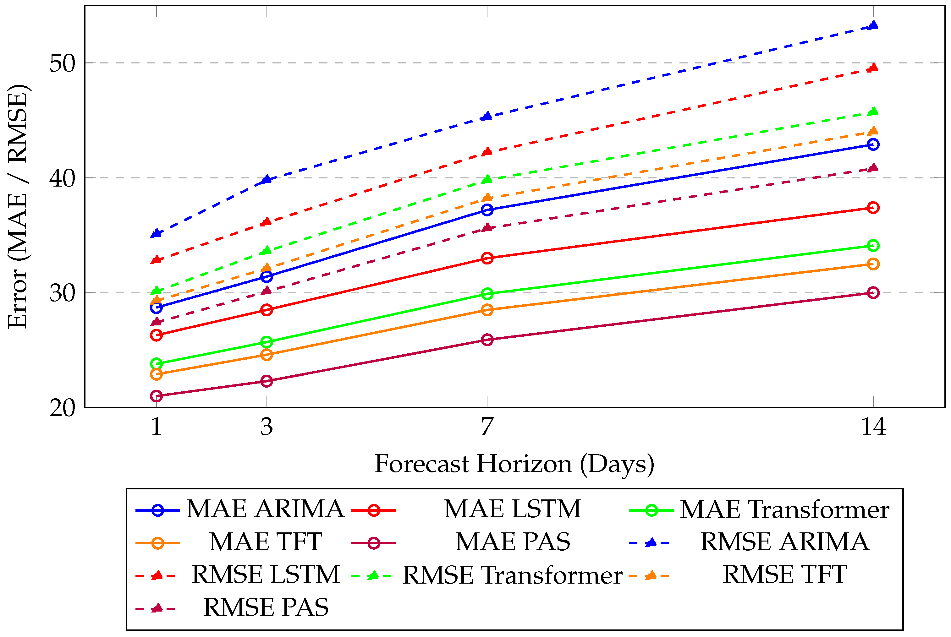 Figure 5 presents the MAE and RMSE trends of all models across four forecast horizons (1, 3, 7, and 14 days ahead). PAS consistently achieves the lowest error values for both MAE (solid lines) and RMSE (dashed lines), showing that it can accurately track both rapid changes and sustained trends in international e-commerce demand. Compared to baseline models, ARIMA and LSTM show a rapid increase in errors with horizon length, while Transformer and TFT exhibit moderate degradation, yet all remain above PAS, highlighting the robustness of PAS across different prediction horizons.