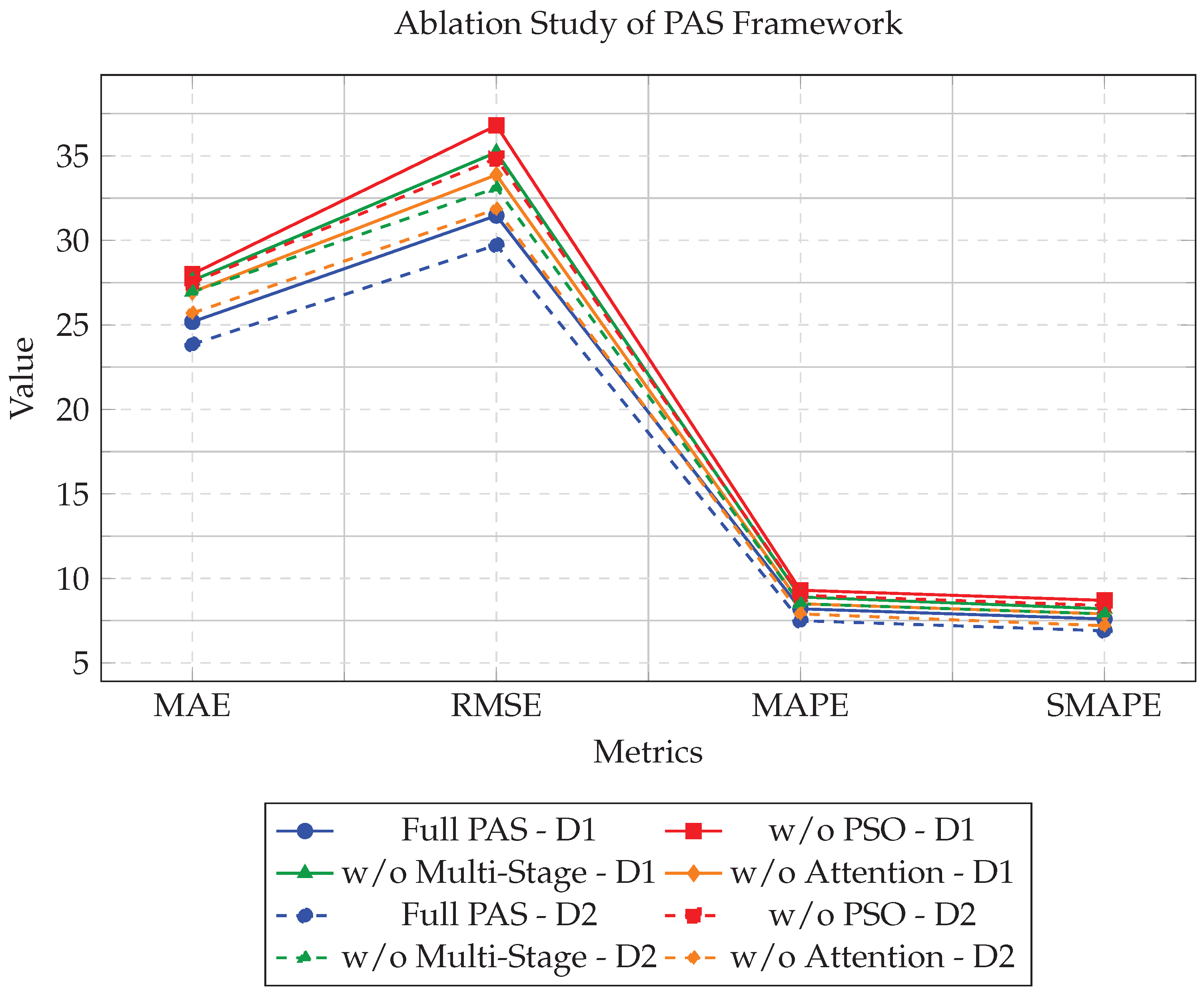 Figure 6 illustrates the ablation study results of the PAS framework on Dataset 1 (Kaggle, solid lines) and Dataset 2 (Antai Cup, dashed lines) across four metrics: MAE, RMSE, MAPE, and SMAPE. As shown, removing any component consistently degrades performance compared to the full PAS model.