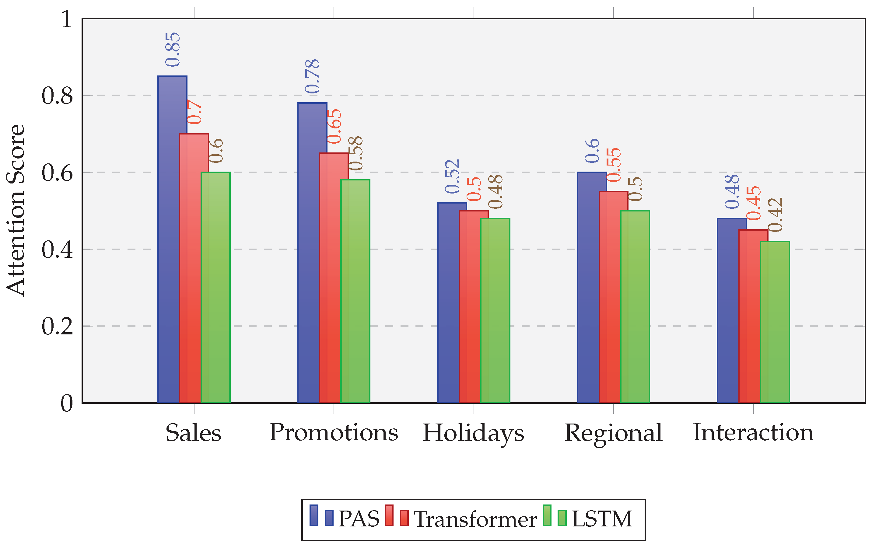 Figure 7 shows a radar chart of average attention scores across key feature groups: historical sales, promotions, holidays, regional indicators, and user interactions. The results indicate that PAS consistently assigns higher attention to recent sales trends and promotional events, highlighting its ability to capture key demand drivers. Features such as holidays and regional indicators receive moderate attention, reflecting their secondary yet meaningful influence. The attention distribution confirms that PSO-guided learning effectively adjusts the importance of different features based on their contribution to prediction accuracy.