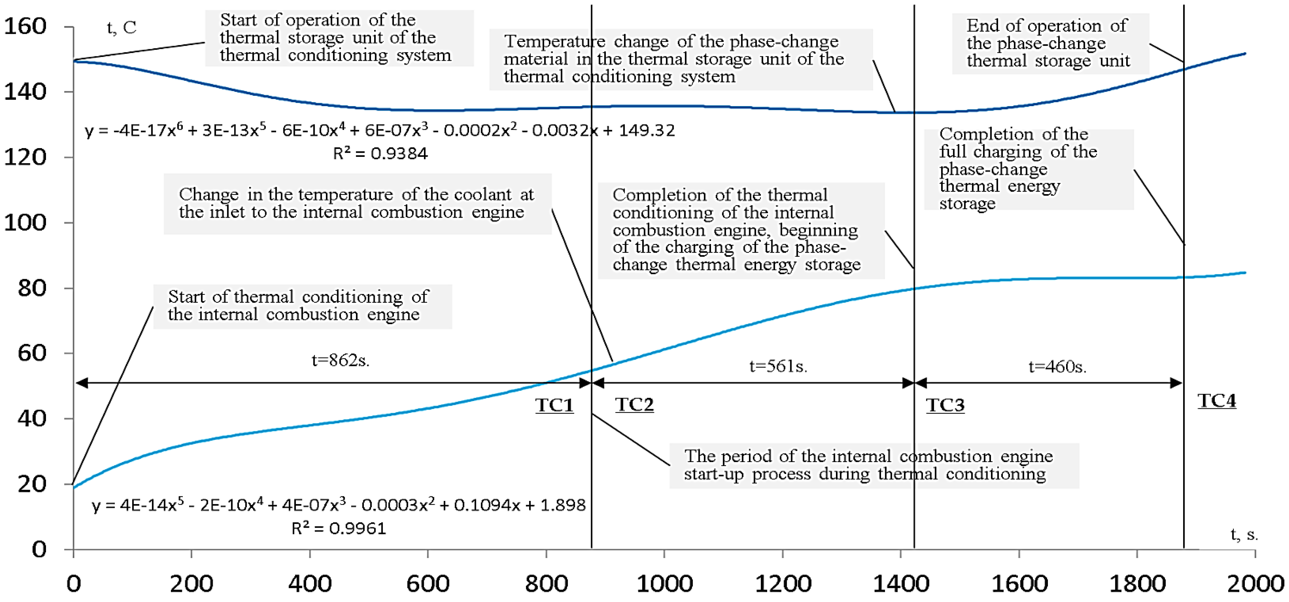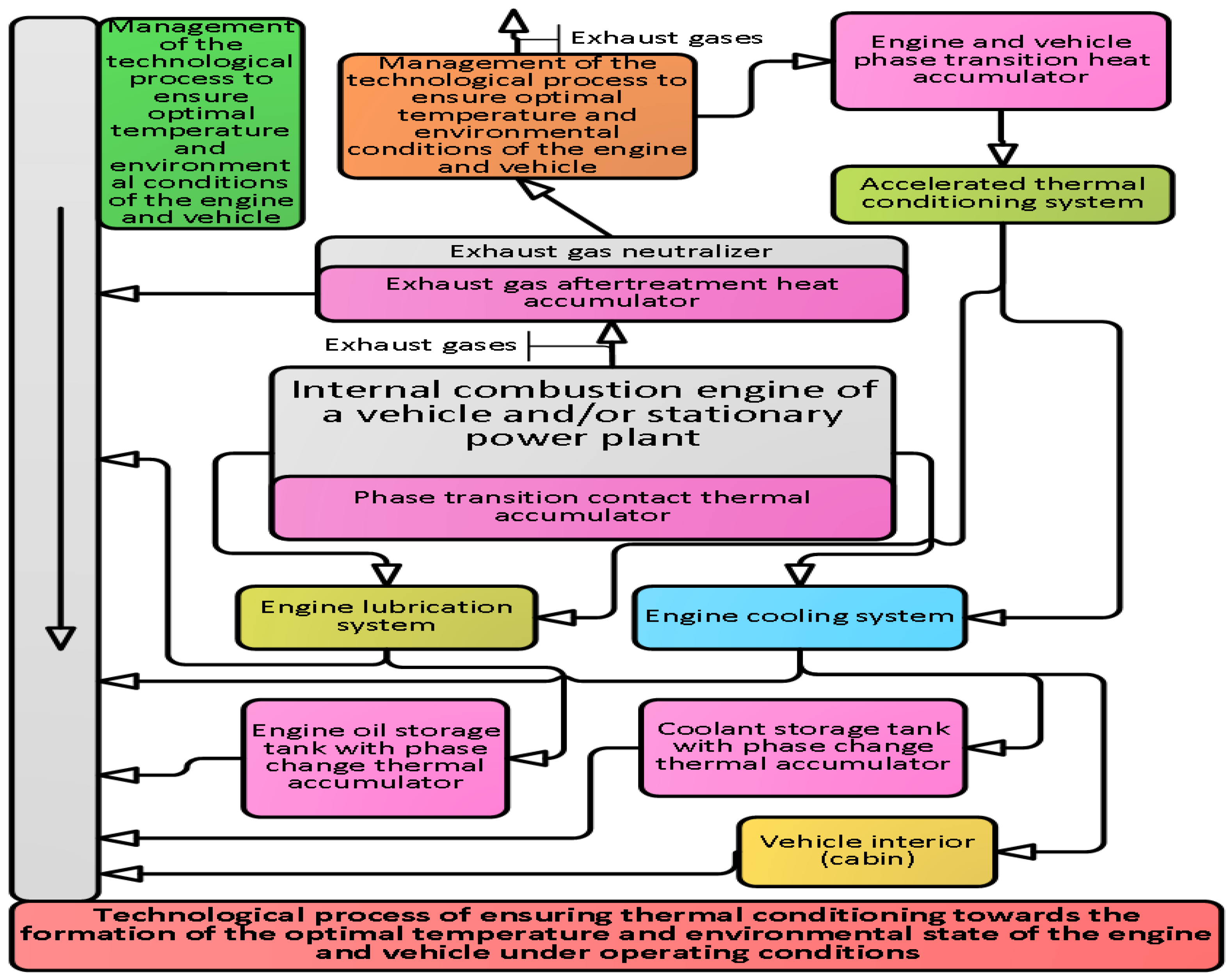 - Engine warm-up processes during post-start thermal conditioning (Q2): conversion of fuel energy into thermal and mechanical energy of the engine; transformation of the latent heat of phase transition in the system elements into thermal energy for additional heating of the engine heat-transfer media. In parallel, heating of the vehicle passenger compartment is carried out through the engine cooling system, and accelerated heating of the catalytic converter is provided by the corresponding thermal energy storage unit of the exhaust gas aftertreatment system.