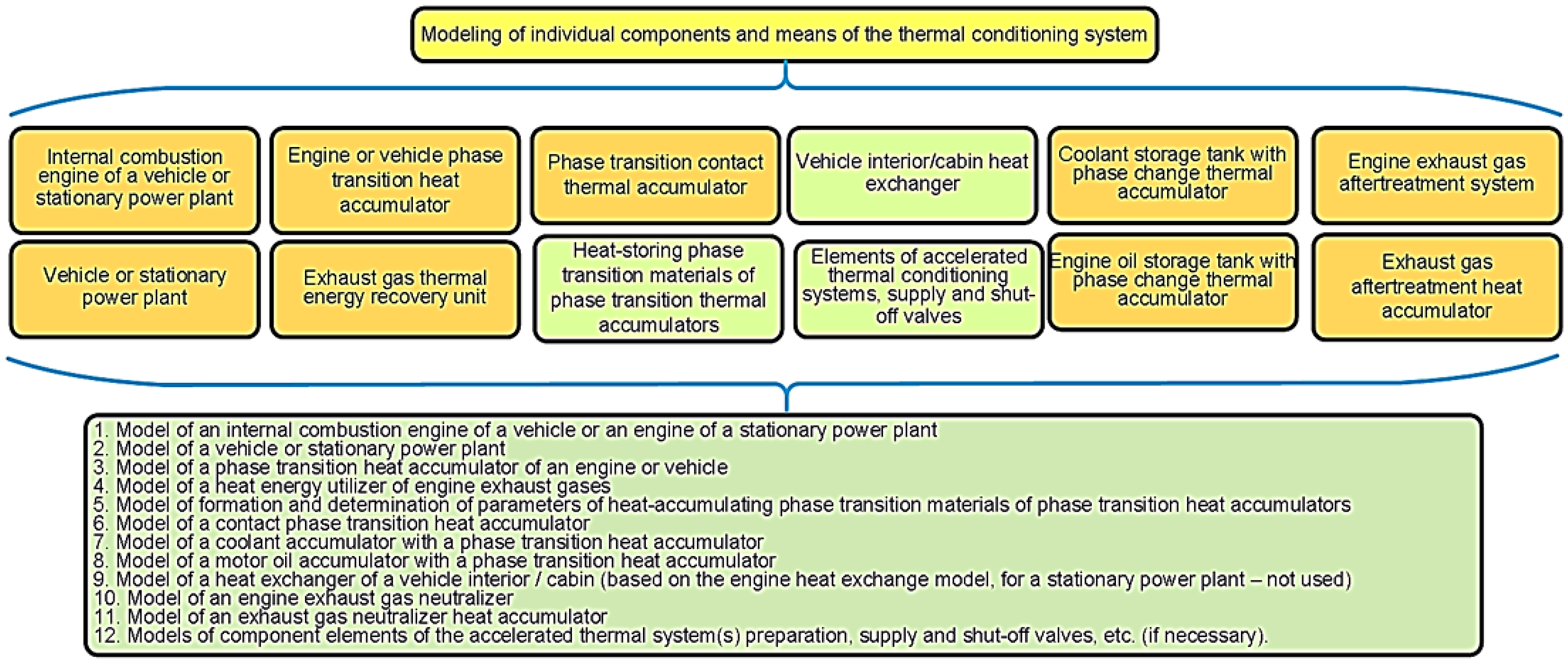 - For engine warm-up from ambient temperature to 50 °C and from 50 °C to 85 °C within the cooling system—the following configuration: the standard system + an accelerated warm-up subsystem + a phase change thermal energy storage unit;