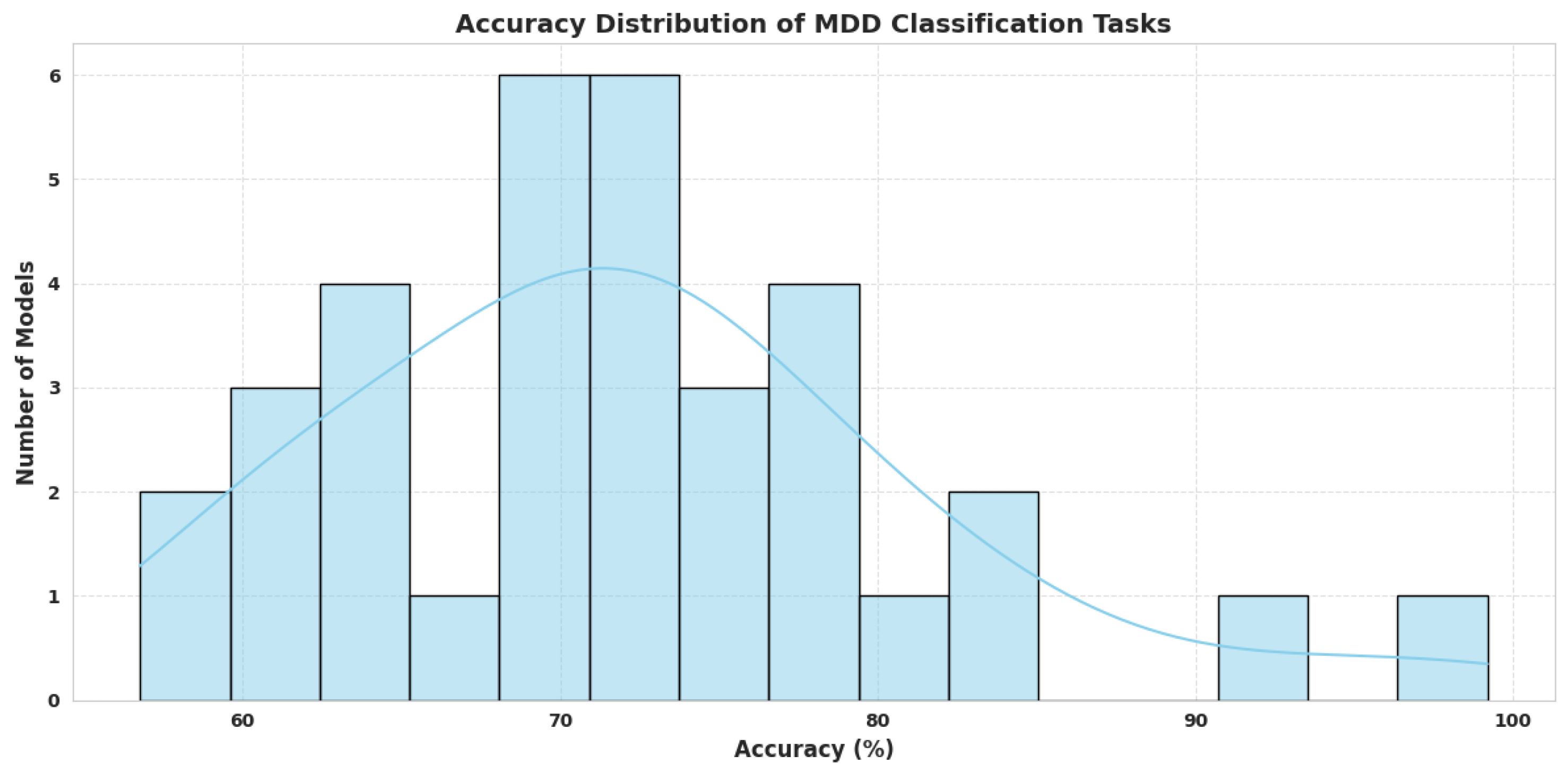 3.3. RQ3: What Are the Most Common Deep Learning Techniques Applied, and to What Extent Do They Accurately Detect MDD?