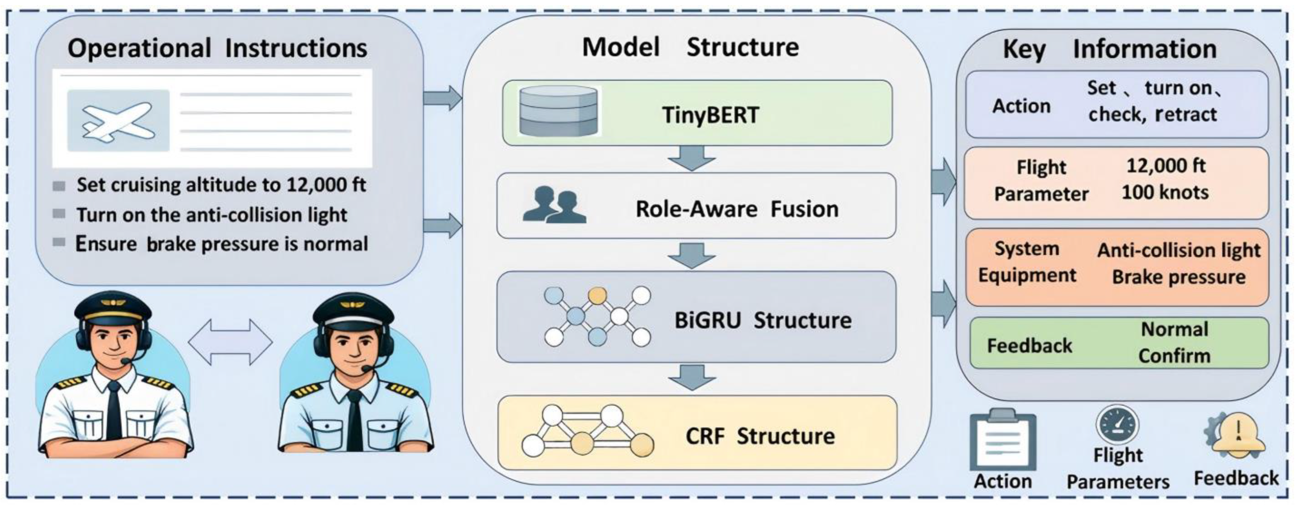 To address the aforementioned challenges, this paper proposes a key information extraction method tailored for flight crew operational instructions. First, to resolve role semantic ambiguity, a role-awareness module is introduced, integrating role condition information into the representation learning process, thereby enhancing the separability and recognition accuracy of key elements. Second, TinyBERT is adopted as a lightweight pre-trained encoder to balance domain semantic representation with deployment efficiency, providing robust contextual representation capabilities while optimizing inference efficiency through two-stage distillation [8,9]. Finally, BiGRU is used for bidirectional context modeling and CRFs are applied for global decoding constraints to improve label transition patterns and boundary prediction stability [10]. The overall process is as shown in Figure 1.