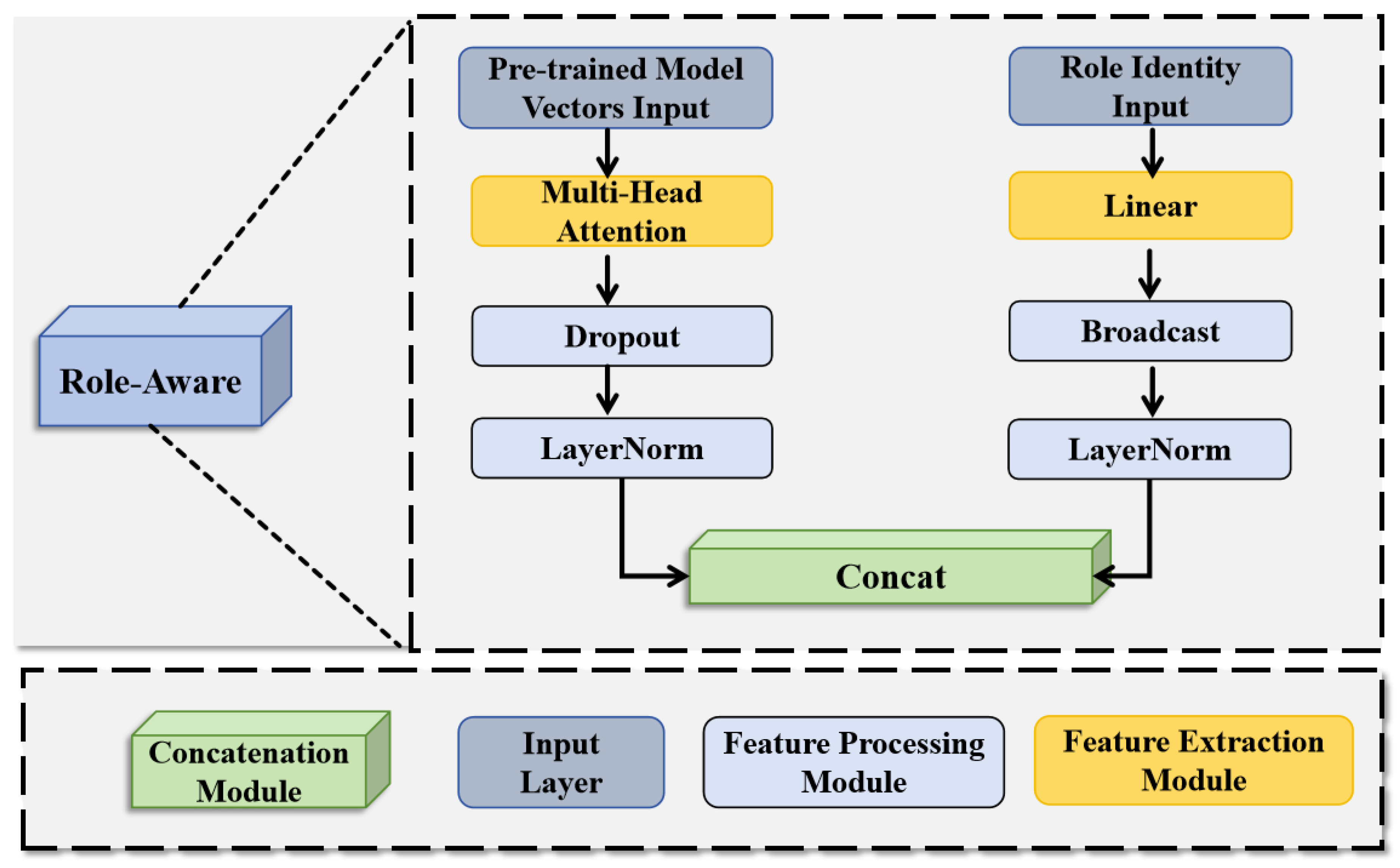 Here, H ctx R T × d model   integrates both the global contextual attention information and maintains the stability of the underlying semantics through the residual structure. Finally, the RAF module integrates the processed context features H c t x with the normalized role features H r o l e via the Concat function, which performs a head-to-tail concatenation of these two heterogeneous vectors along the feature dimension. This operation achieves a deep fusion of semantic information and identity features, thereby generating the final role-aware feature representation X R A F .