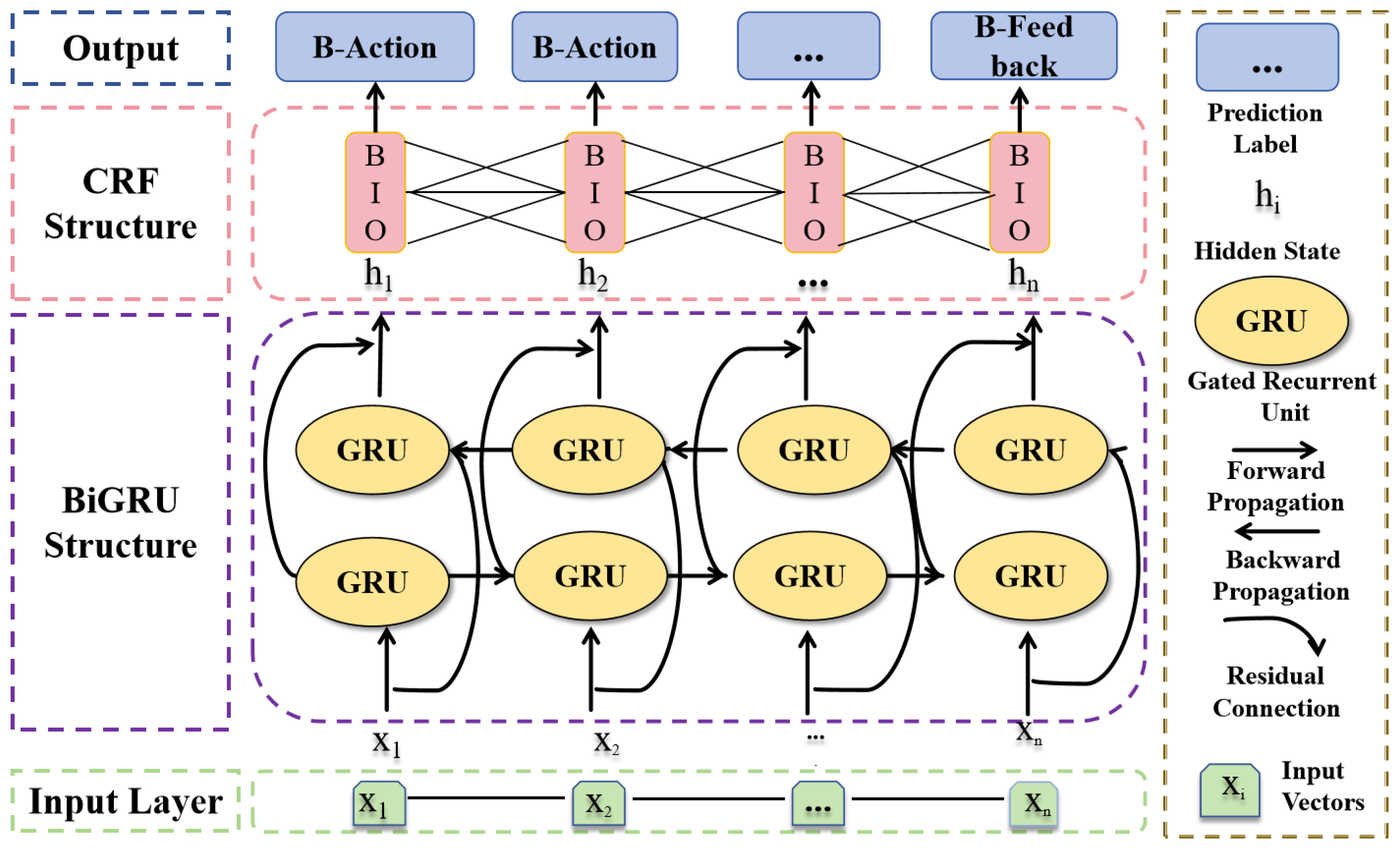 BiGRU, through its bidirectional propagation mechanism, is capable of simultaneously capturing contextual information from both the preceding and following contexts in the sequence. This addresses the shortcomings of traditional RNNs in handling long-term dependencies. Its bidirectional structure is particularly well-suited for processing complex sequential data, enhancing the model’s ability to understand long-distance dependencies and context. When combined with the role-aware module, BiGRU further improves the model’s precision in capturing key information, especially when processing complex instructions, as it effectively focuses on the contextual relationships of important parts within the input sequence. With the help of forward and backward propagation paths, the model accurately captures forward sequence dependencies and deeply mines backward sequence association information. Additionally, the introduction of CRFs for structured decoding models the transition constraints between adjacent labels, enabling a global optimal path search, thus improving the consistency of the label sequence and the stability of boundary predictions. This further enhances the model’s contextual understanding and the accuracy of instruction recognition. The structure is shown in the Figure 4: