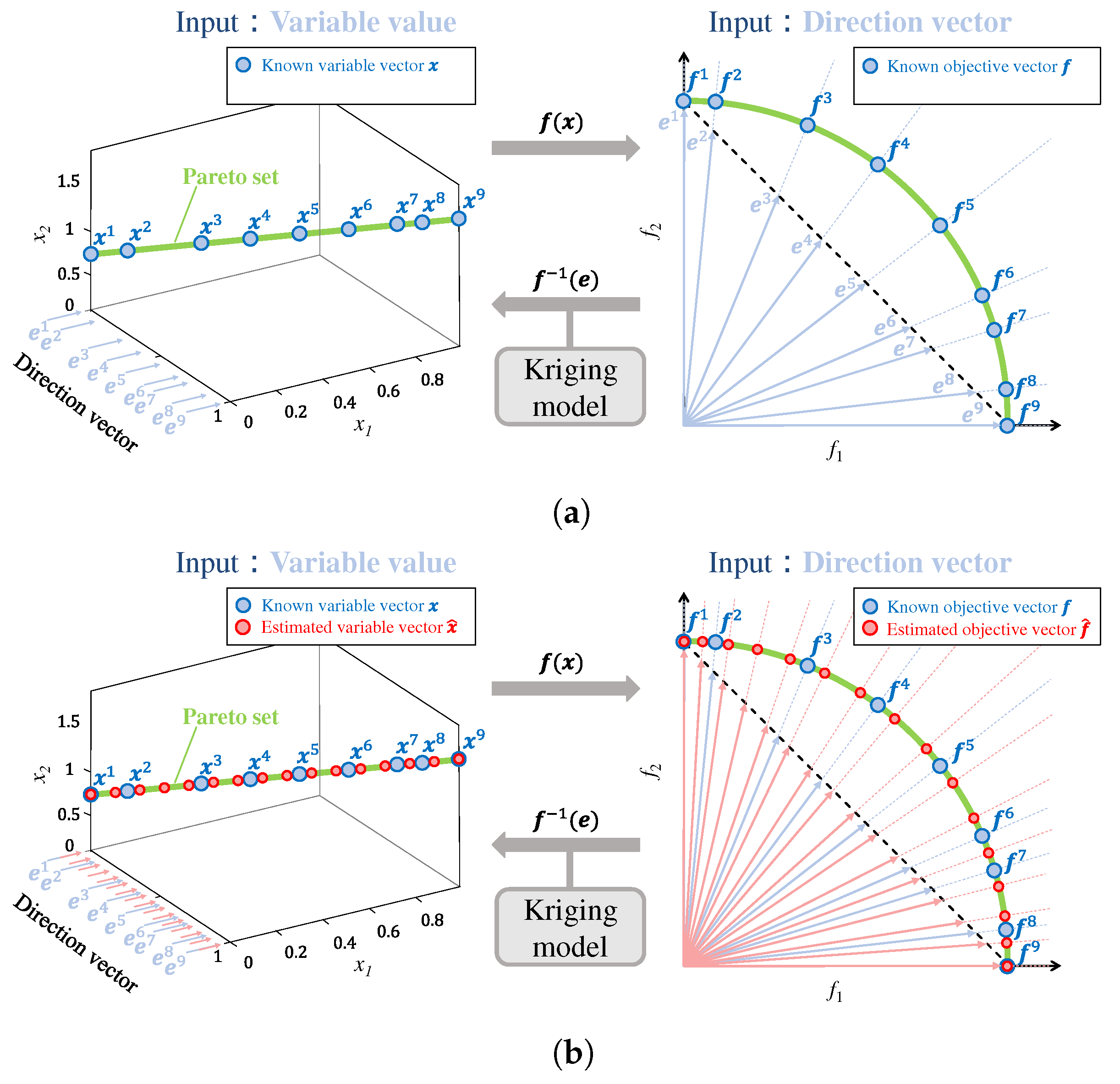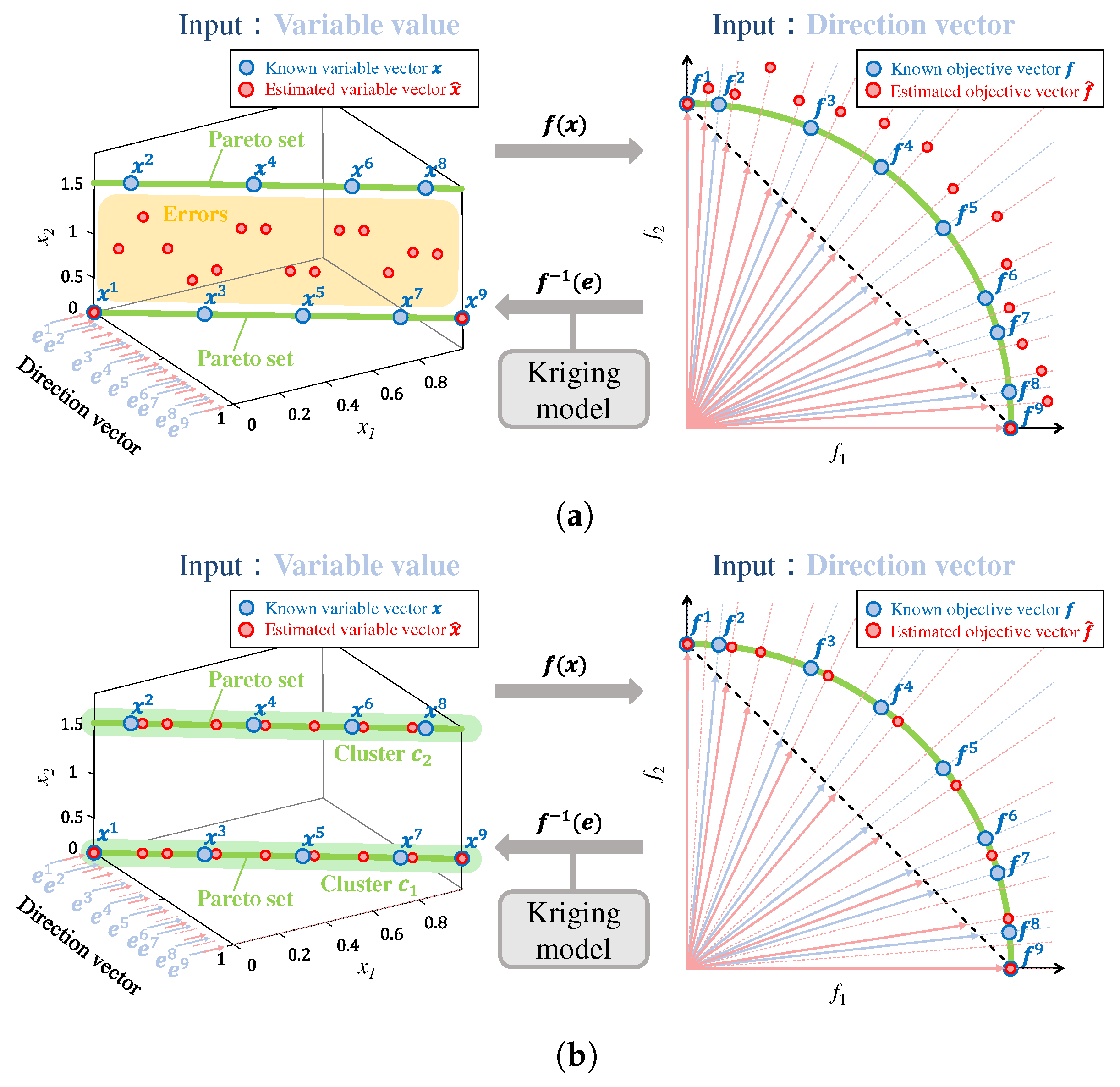 , multiple candidate variable vectors can be generated for the same objective-space direction. This cluster-wise independence allows distinct variable vectors to be estimated for the same objective-space direction when multiple local Pareto-set branches coexist.