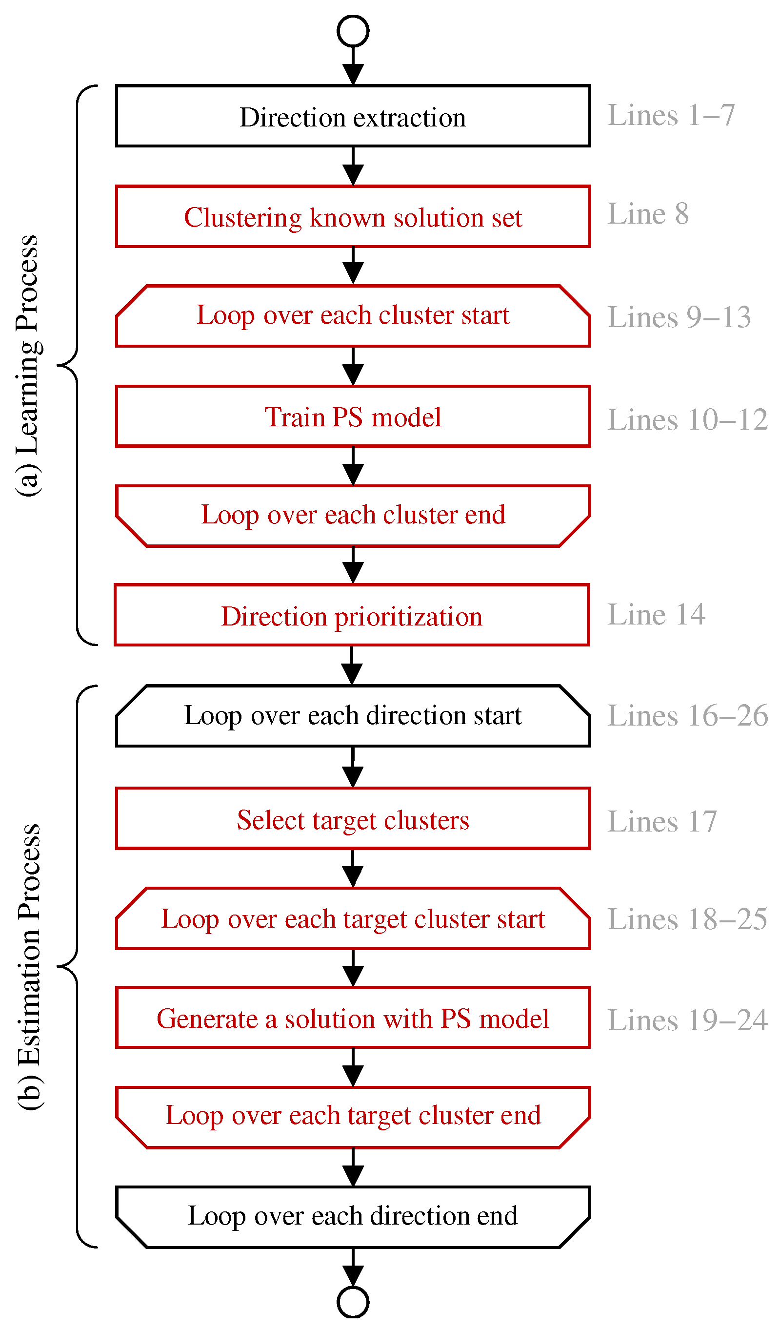 Figure 3 presents a flowchart of the proposed multimodal PSE method to facilitate understanding of the overall procedure. To improve traceability, the corresponding line numbers in Algorithm 5 are also indicated in the flowchart. The differences from the conventional PSE method in Algorithm 1 are marked in red. At line 8, the known solution set is divided into clusters