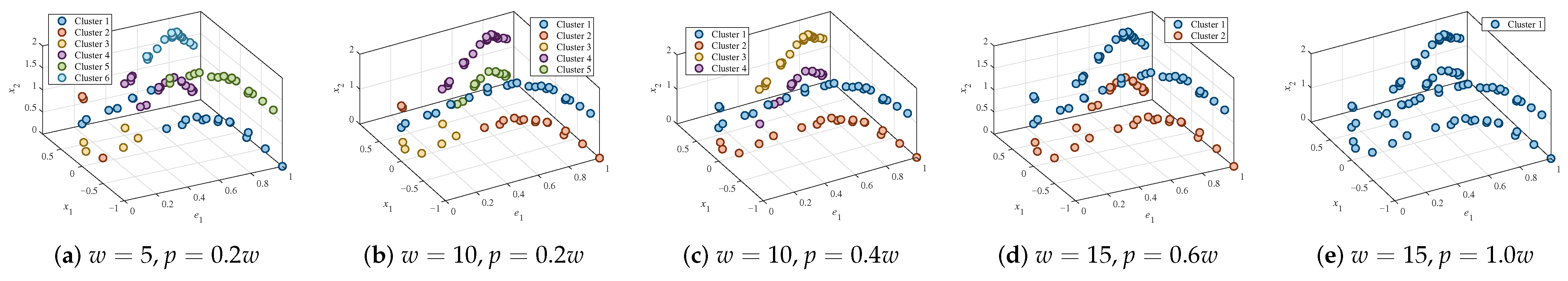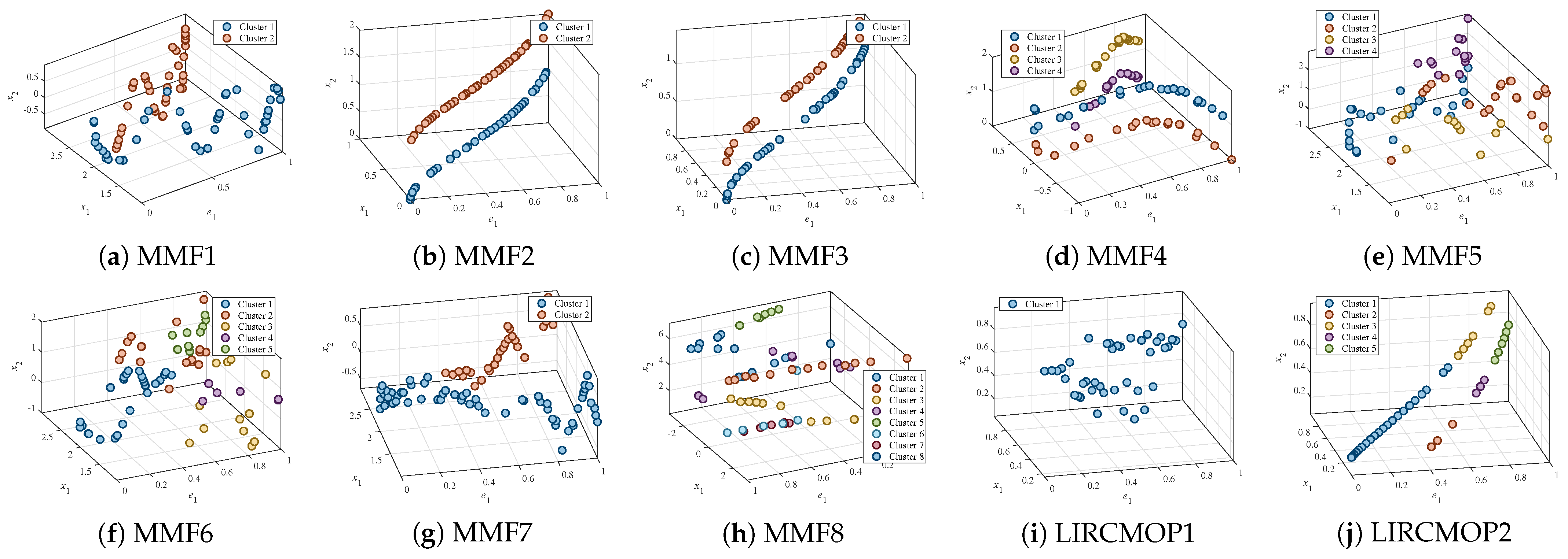 Returning to Algorithm 2, in lines 5–7, the cluster numbers () obtained for dimension j are stored as in the cluster vector set . After repeating lines 2–8 for all D dimensions, the cluster vector set is completed. Finally, line 9 groups the known solutions () whose cluster vectors are identical and outputs the final cluster vector .