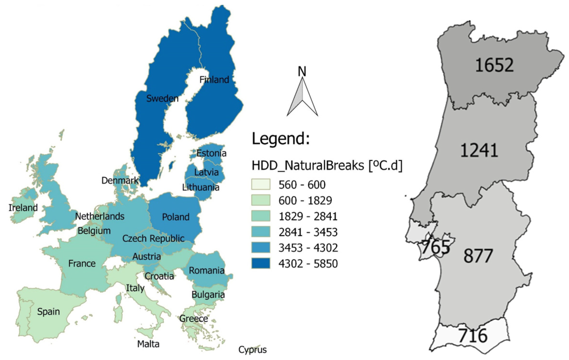 Figure 3 illustrates the spatial distribution of heating degree days (HDDs) across Europe and within Portugal’s five main regions. Portugal records an average of approximately 1166 HDDs—about 62% lower than the EU-27 average of 3076 [