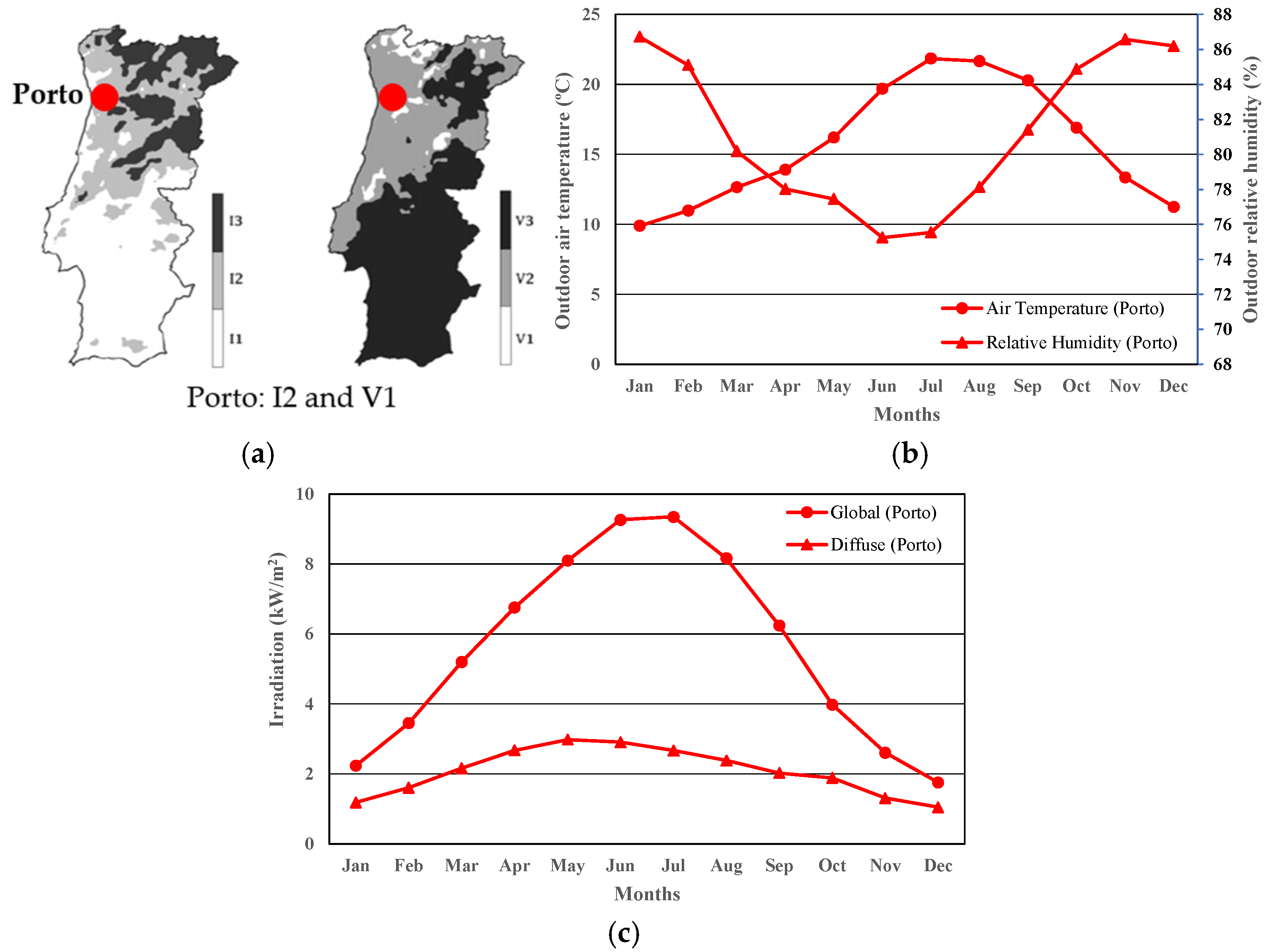 33]. The simulations rely on a TMY, which represents long-term average climatic conditions for Porto. This approach is widely used in PV performance modelling; however, it does not explicitly account for interannual variability or long-term climate change trends. Although the Atlantic Ocean exerts a strong moderating influence on Northern Portugal, resulting in relatively small year-to-year fluctuations in solar irradiation, the cumulative impact of climatic changes over a 15–20-year system lifetime may influence long-term energy yields and economic performance.