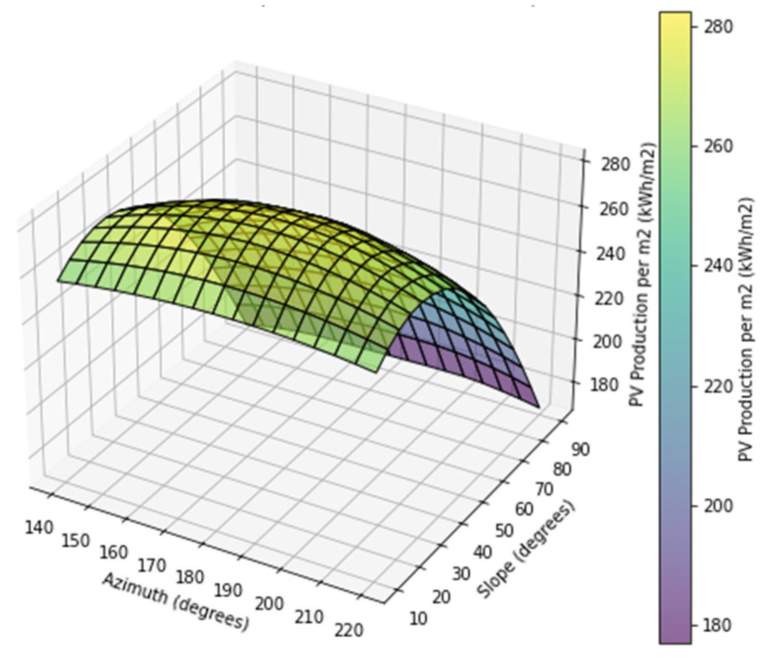 First, the photovoltaic (PV) performance under different slope and azimuth configurations was studied for Porto. For that, slopes from 10 degrees to 90 degrees and azimuths between 220 and 140 (where 180 is full-south orientation, with higher numbers indicating a westward direction) were applied to a single PV module (see