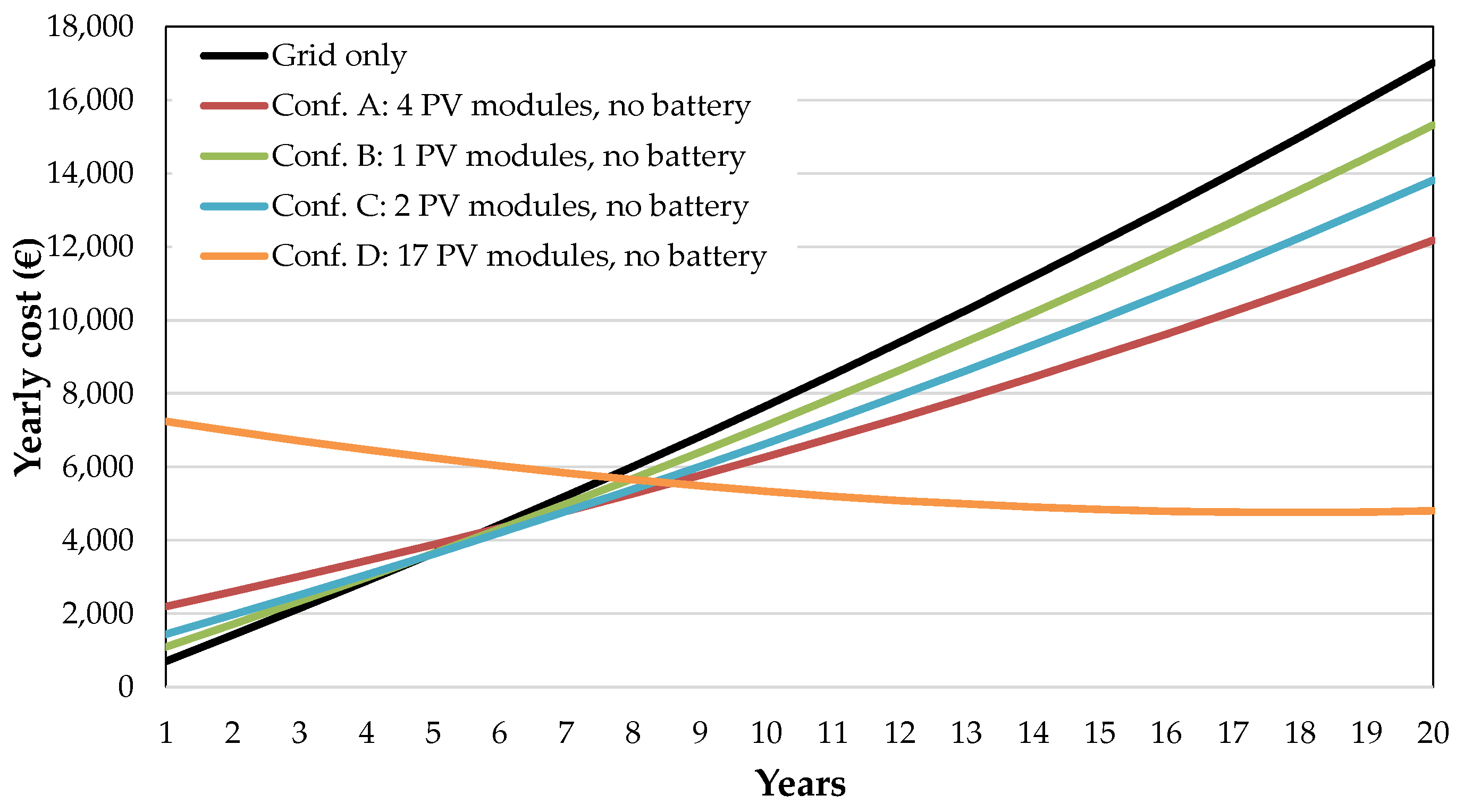 Thus, configuration A stands out as the most economically balanced option, reaching €4834 in accumulated savings over 20 years. These results confirm that photovoltaic systems without storage can provide excellent economic returns, especially when sized to align with household consumption patterns.