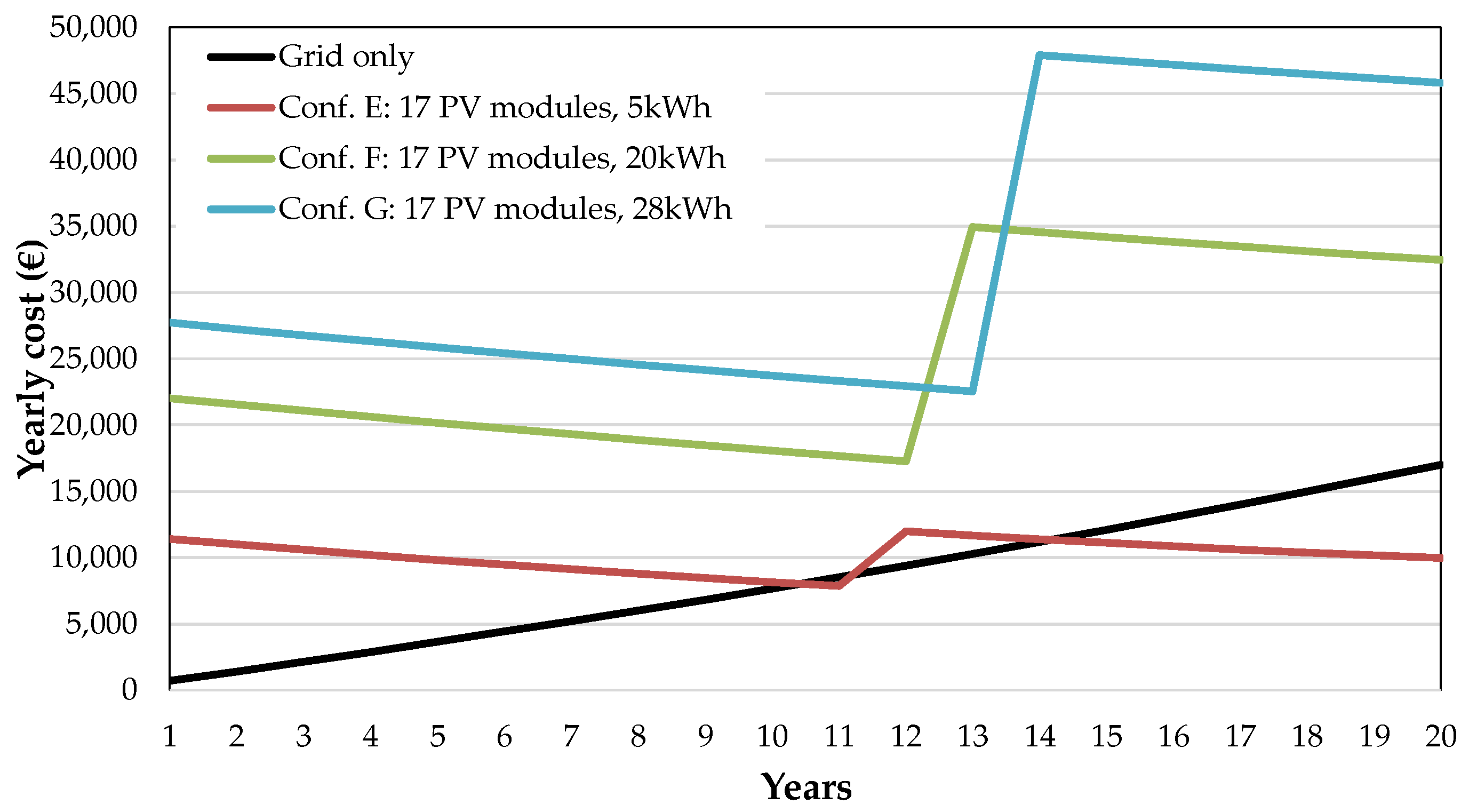 However, the economic implications of storage are considerably less favourable. Battery systems significantly increase the total cost of investment, and the need to replace the battery when it reaches 70% of its capacity further amplifies long-term expenses. Configuration E requires an initial investment of 11,841 €, plus 3555 € for replacement, while configurations F and G reach 22,506 € and 28,194 €, respectively, with proportionally higher replacement costs. Consequently, the economic performance of large battery systems is weak. Configuration E achieves a payback period of 10.4 years, substantially longer than any configuration in Scenario 2, while configurations F and G do not achieve payback within the 20-year analysis period, generating instead negative savings of −15,452 € and −28,800 €, respectively.