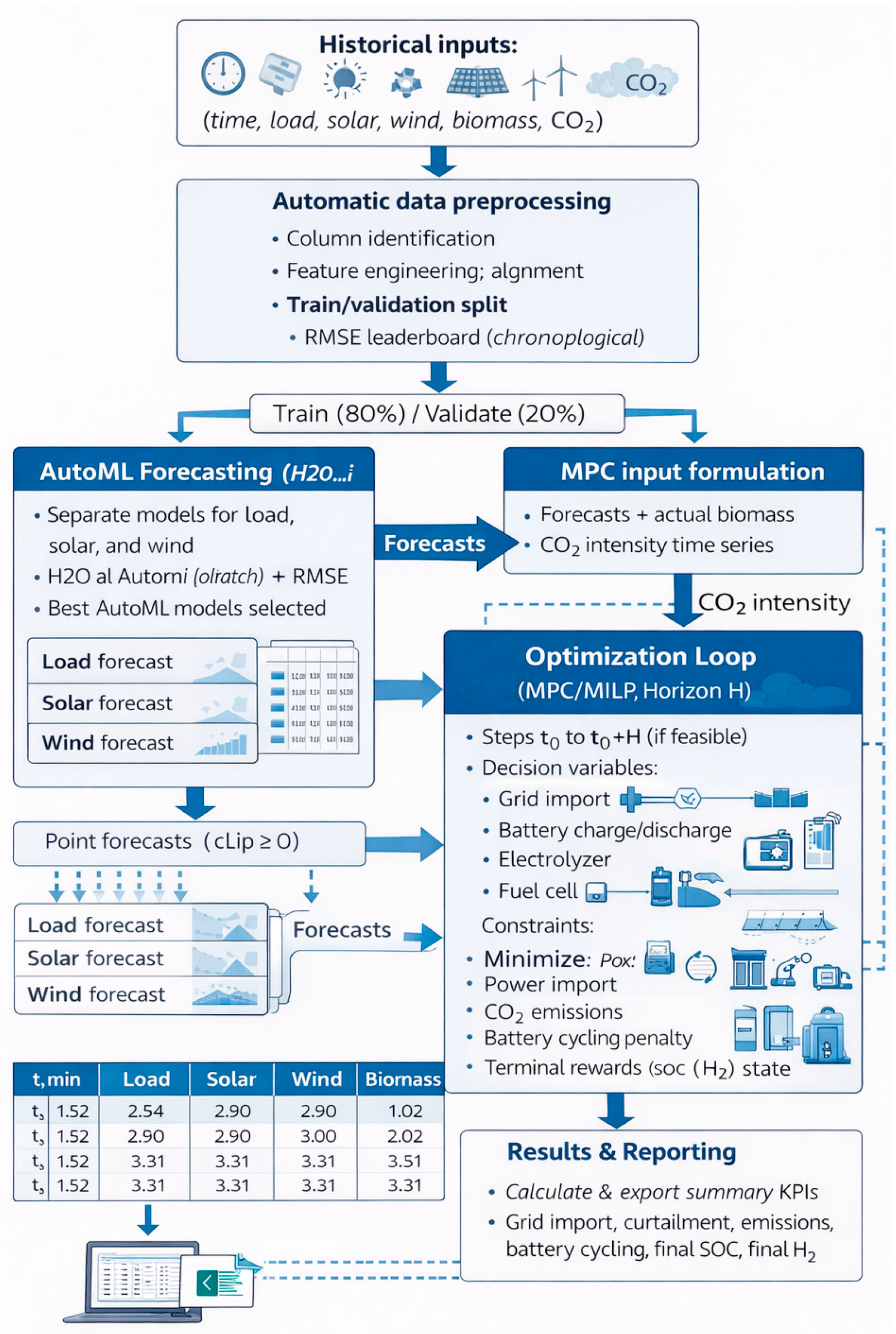 This system is a HRES management solution that combines data-driven forecasting and model-based optimization to meet the electricity load at the lowest cost and emissions. Time, seasonality, and lag features are automatically prepared from historical data, according to which H2O AutoML models predict electricity demand and solar and wind generation. These forecasts, together with actual biomass generation and intensity, are used in an MPC (Model Predictive Control) scheme, where a MILP optimization problem with a moving horizon is solved at each time step. The optimization selects battery charging and discharging, hydrogen production by electrolyzer, electricity production by fuel cells, energy curtailment, and grid import solutions in a way that ensures energy balance, complies with technical constraints, and minimizes import costs and the associated footprint. Additionally, mild penalty factors are applied for battery cycling and energy waste, and the final state (battery SOC and stored ) is included as a terminal reward to promote long-term system sustainability. The import ‘cost’ in this work is modeled as a weighted penalty (proxy) rather than a real dynamic market price. The results combine actual data, forecasts and optimal management decisions and are presented in a structured report for analysis and decision evaluation.