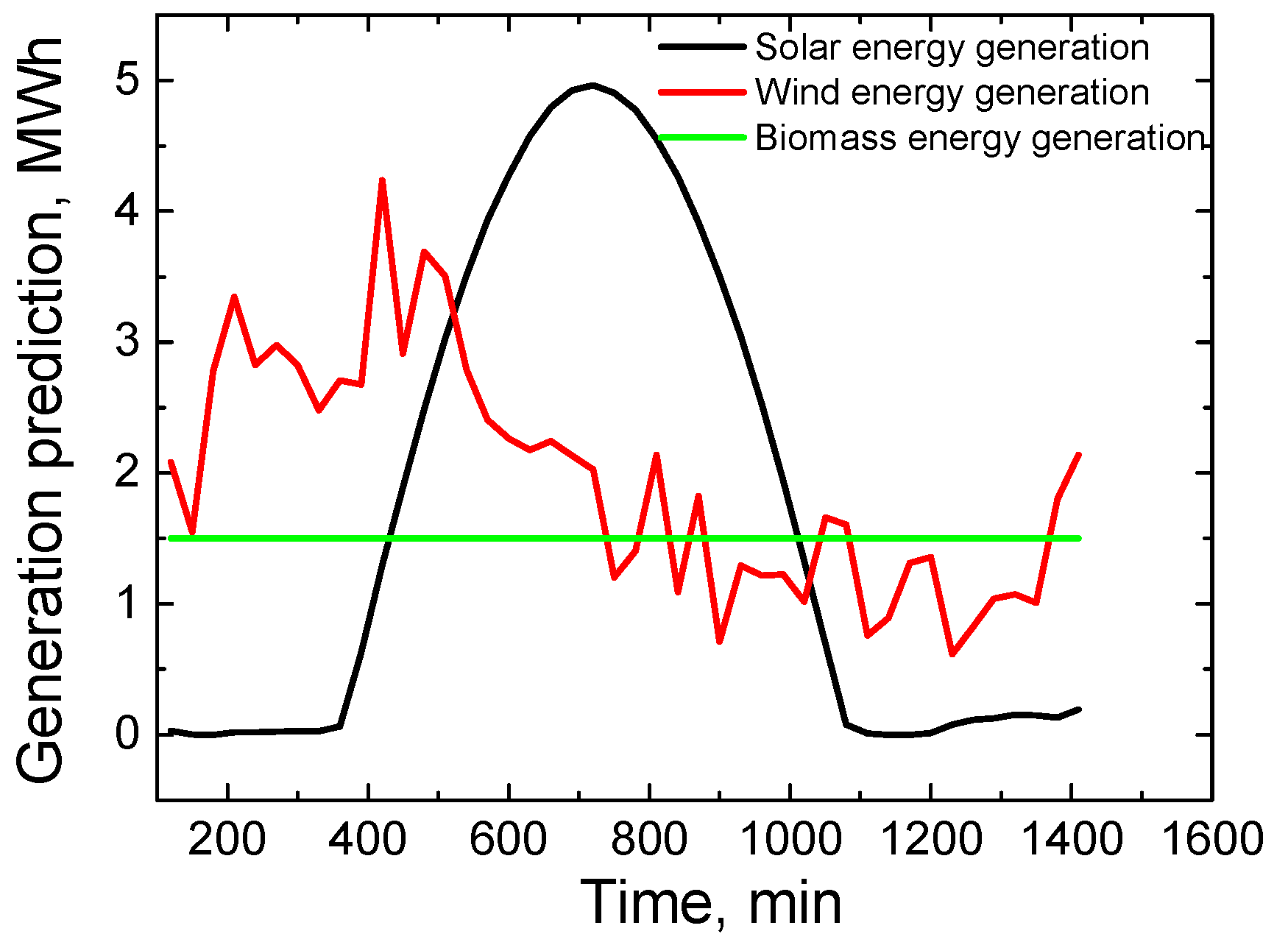 Figure 2 show a much smoother, but more fluctuating production profile typical of wind energy compared to the diurnal cycle of solar generation. At the beginning of the period under consideration (around 120–360 min), the forecasted power fluctuates between approximately 1.5 and 3.3 MWh, without a clear monotonous increase or decrease trend, reflecting the erratic nature of the wind speed. A more pronounced increase is observed at around 420 min, when the generation reaches around 4.24 MWh—the highest value in the entire interval, indicating a short-term episode of increased wind. In the later period (around 450–750 min), the production remains average, mostly in the range of 2.0–3.7 MWh, but more frequent fluctuations are already visible. In the second part of the day, a general downward trend is observed—many values fall to the 1.0–1.5 MWh range, and at some moments (e.g., around 900 min) the generation decreases even to ~0.7 MWh, which can be associated with weakened wind. However, at the end of the period (around 1380–1410 min) the forecast again shows an increase to more than 2 MWh, suggesting a renewed strengthening of the wind. Overall, the forecasted profile is characterized by stochastic, short-term peak and dip behavior, which is physically justified for wind energy and is particularly important when planning storage and balancing measures in a hybrid energy system [