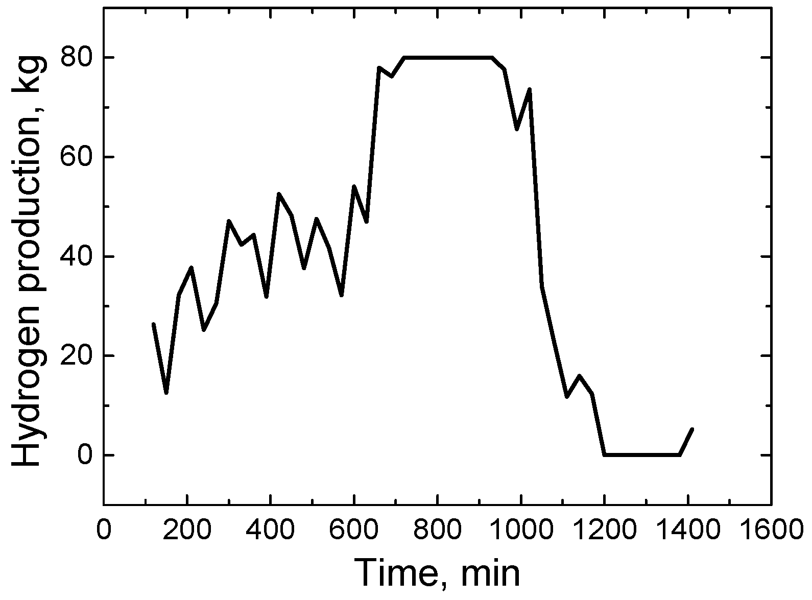 Figure 4). At the beginning of the period under consideration, hydrogen production is already small (about 12–32 kg per step at 120–240 min), which indicates episodic short-term generation surpluses at certain moments, which are used by the MPC for hydrogen production, although the overall system balance at this stage still remains close to neutral or slightly deficit. Further, as solar generation increases and wind production remains sufficient, hydrogen production consistently increases—in the interval of about 300–600 min, the values increase to about 50–55 kg per step. From about 720 min, a stable maximum production is reached—about 80 kg per step—and this level remains until about 930 min, indicating that the electrolyzer is operating in a mode close to nominal power and absorbs most of the excess electricity. Later, as solar generation decreases and the load share increases, hydrogen production gradually decreases—from about 78 kg at 960 min to less than 20 kg at 1110–1170 min, and from about 1200 min it becomes zero, i.e., the electrolyzer is switched off when local generation becomes insufficient for surplus formation. Overall, this profile confirms that the electrolyzer in the HRES system acts as a flexible consumer of surplus energy—actively switched on when there is surplus generation and switched off when energy becomes needed for direct load coverage [