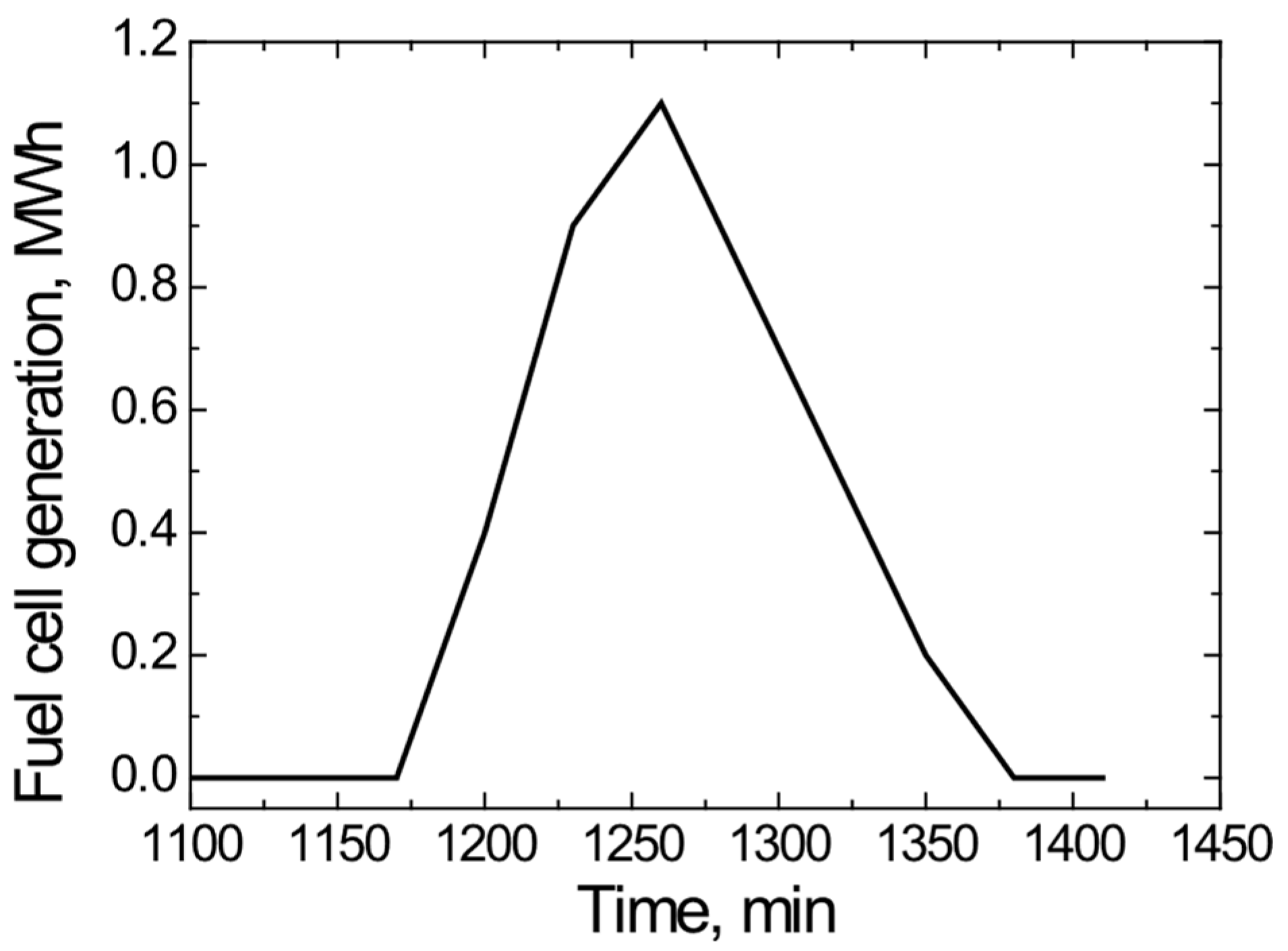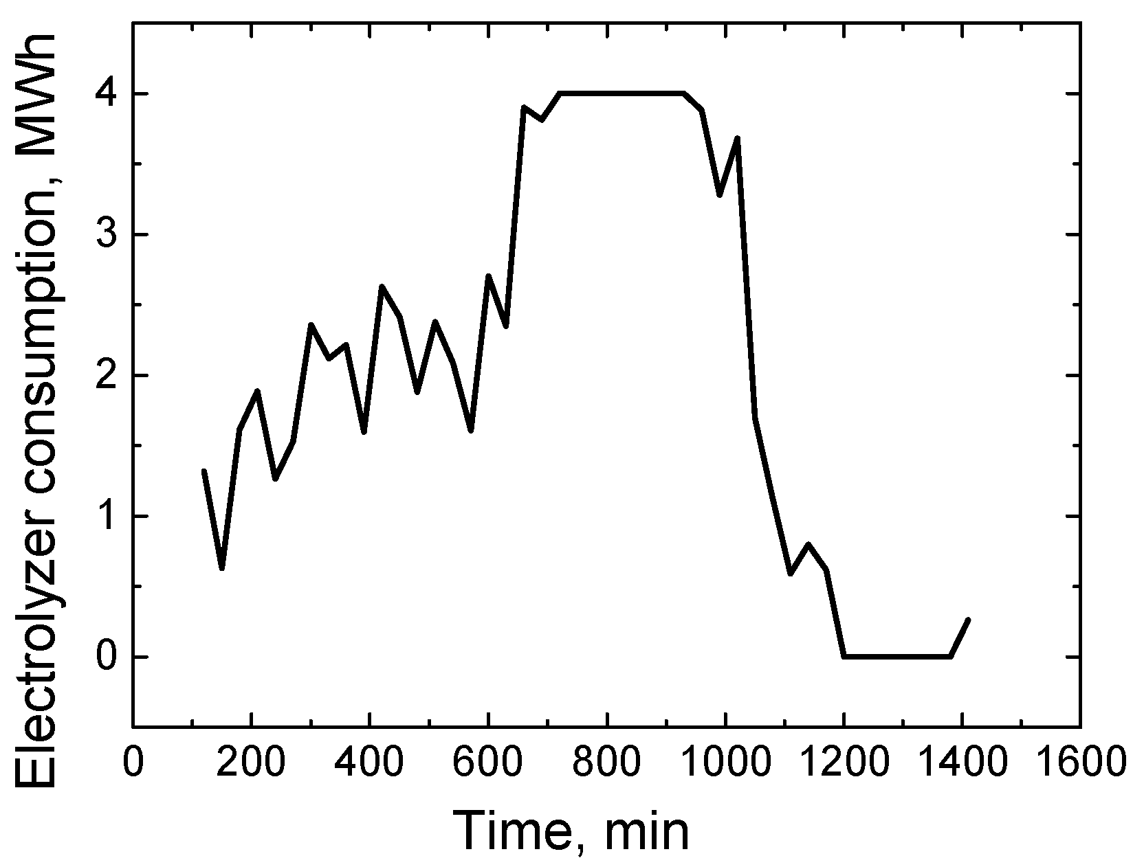 Figure 5). At the beginning of the period under consideration, the electrolyzer is already periodically operating in a low-power mode (about 0.6–1.9 MWh per step at 120–300 min), which indicates episodic short-term generation surpluses at certain moments, which are used by the MPC for hydrogen production, although the overall system balance at this stage still remains close to neutral or slightly deficit. Further, as solar generation increases, the consumption consistently increases and reaches a higher operating level at about 600–690 min (about 2.3–3.9 MWh). From about 720 min, the electrolyzer reaches its nominal operating limit—about 4 MWh per step—and this maximum load remains quite stable until about 930 min, indicating that the system has a significant surplus of renewable energy at that time, which is efficiently converted into hydrogen. Later, as solar generation decreases and the load ratio increases, the electrolyzer power is gradually reduced—from about 3.9 MWh at 960 min to less than 1 MWh at 1110–1170 min. From about 1200 min, the electrolyzer is essentially turned off, as local generation becomes insufficient to form a surplus. Very small digital consumption pulses at the end of the model period are insignificant and are not reflected in the graphs, therefore hydrogen production at this stage is considered zero. Overall, the profile shows that the MPC uses the electrolyzer as a flexible balancing device—it actively absorbs excess energy during the period of maximum generation and gradually turns off when energy becomes needed for direct consumption [