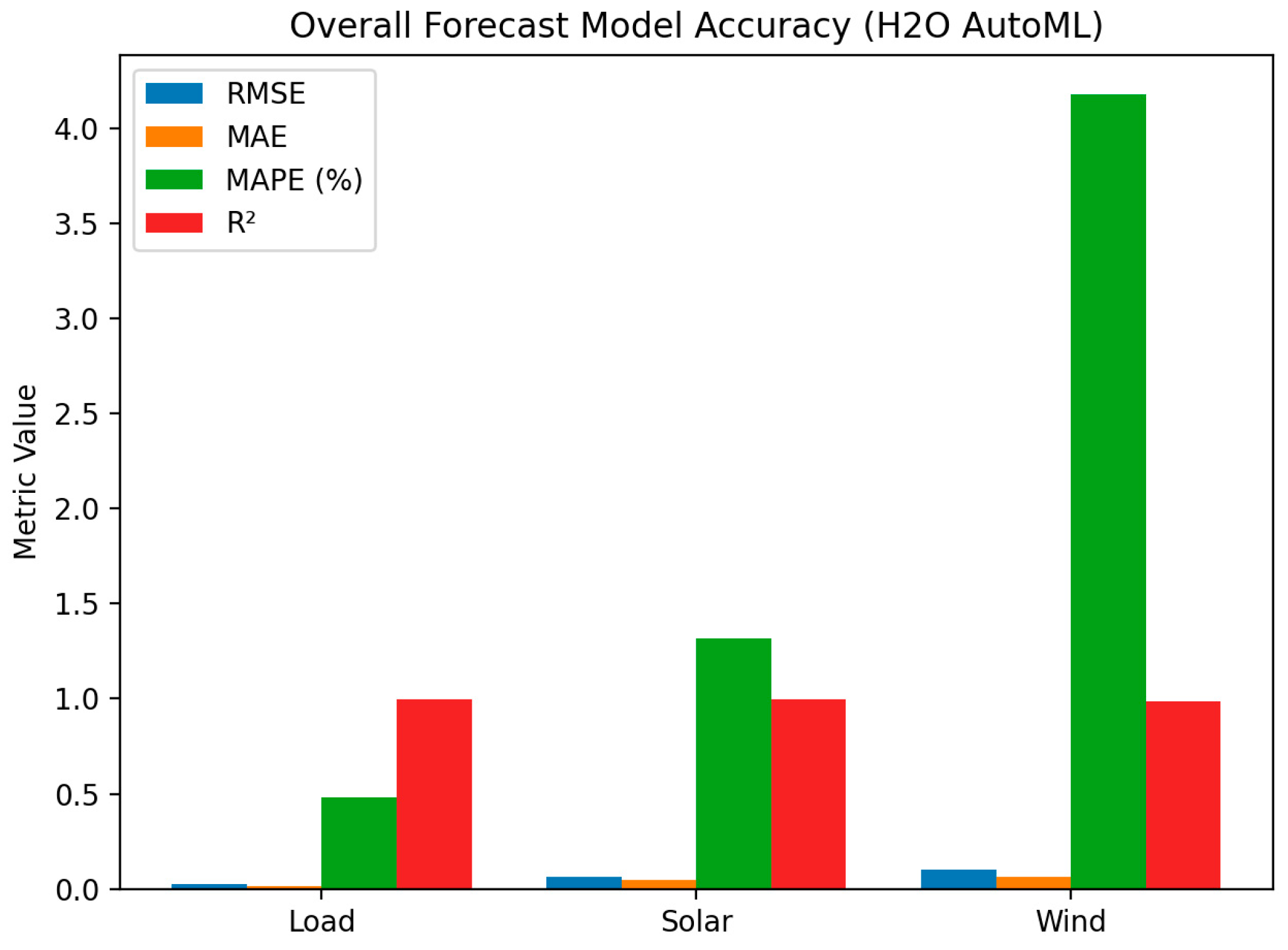 The presented chart “Overall Forecast Model Accuracy (H2O AutoML)” summarizes the accuracy of the models for all three forecast variables—electrical load, solar and wind generation—using four main evaluation indicators: RMSE, MAE, MAPE and R
