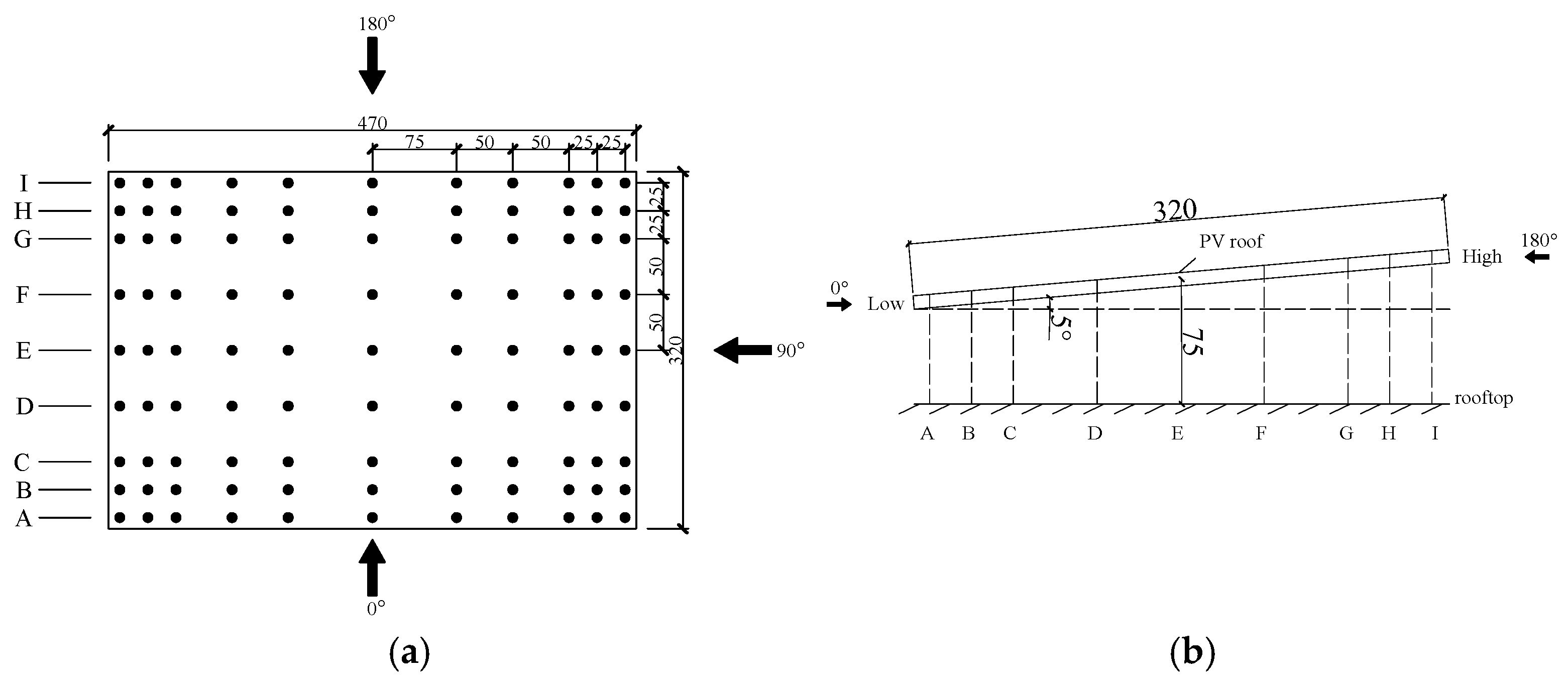 Figure 1. Wind tunnel test models: (a) arrangement of pressure taps on the model; (b) elevation view of the photovoltaic panel (the letters A–I in the figure denote the row numbers of the measuring points, which help to identify that the windward side at a 0° wind direction angle is the low eave side of the roof).