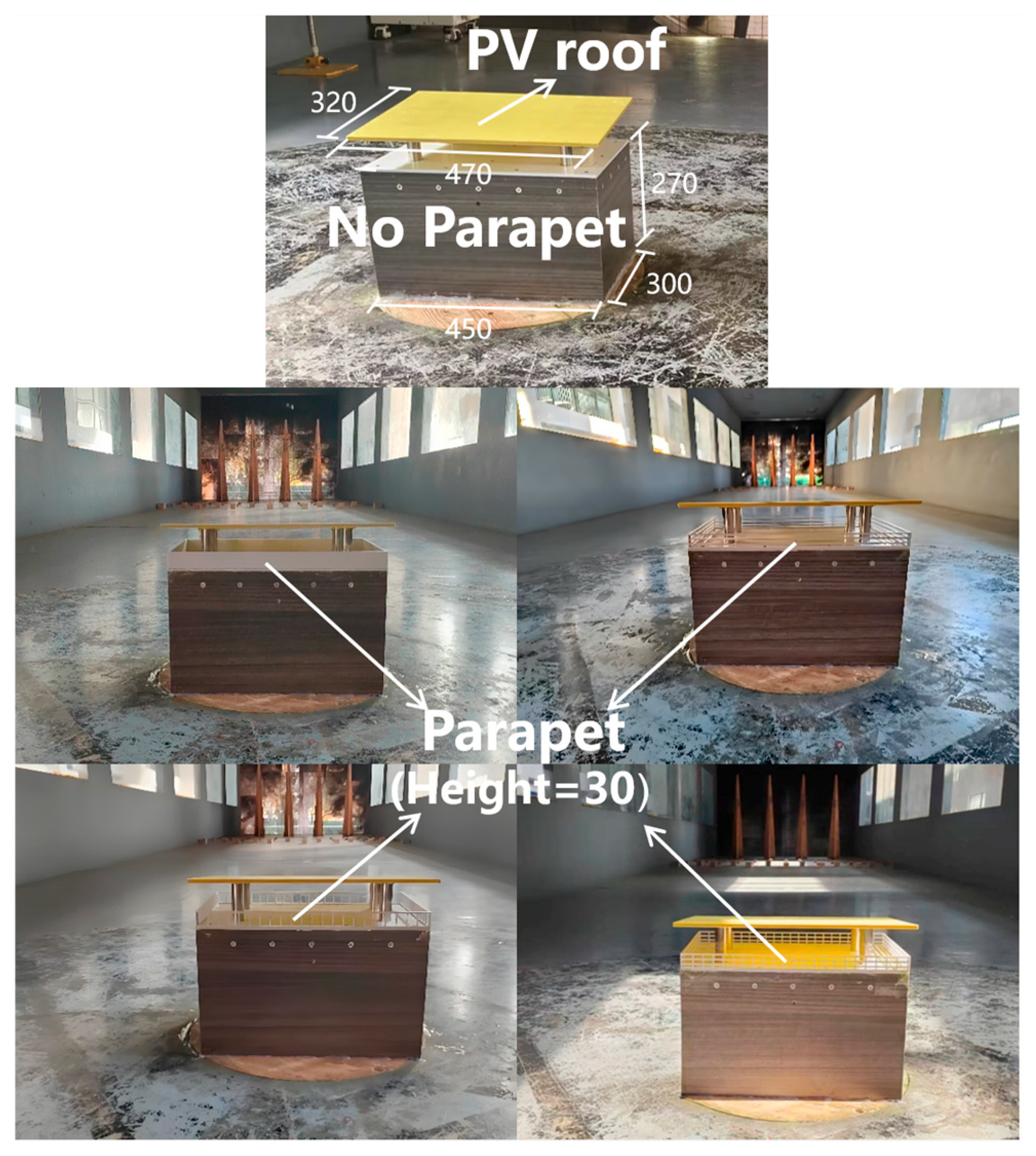 Current research on rooftop distributed photovoltaics mainly focuses on photovoltaic arrays. Alrawashdeh et al. conducted wind tunnel tests on rooftop photovoltaic array models with three different scale ratios, revealing that the peak wind pressure coefficients on the photovoltaic panels of the middle modules vary significantly with wind direction [12]. Cosoiu et al. combined numerical simulations with wind tunnel experiments and found that the wind pressure distribution on photovoltaic panels exhibits a gradual variation [13]. Peng et al. investigated the influence of building height on the wind loads of rooftop photovoltaic panels through wind tunnel tests. Based on k-means clustering analysis, they proposed a mathematical model for the wind loads acting on photovoltaic panels in different roof regions under various building heights [14]. Browne et al. studied the influence of parapets on the wind loads of rooftop photovoltaic arrays with a tilt angle of 10° through wind tunnel tests. They found that the influence of parapets on the peak wind loads of rooftop photovoltaic arrays is caused by multiple aerodynamic phenomena rather than turbulence alone [15]. Wang et al. varied factors such as building plan aspect ratio, height-to-width ratio, and parapet height while keeping the building height constant. The results showed that the maximum negative wind pressure on photovoltaic panels increased with the increase in plan aspect ratio, while the maximum positive wind pressure was almost unaffected [16]. Zou et al. investigated the influence of parapets and rooftop protruding structures on the wind field characteristics of flat roofs. They found that the wind speed over the roof is affected by the airflow around the protruding structures and the wake flow behind the parapets [17]. Pindado et al. studied the influence of different parapet configurations on roof wind loads and found that the reduction in peak negative pressure provided by solid parapets is smaller than that provided by porous parapets [18]. Baskaran et al. investigated the influence of parapets on the wind load characteristics of various building roofs. They found that when parapets lower than 1 m are applied to buildings, the suction at the roof corners may increase significantly [19]. Huang studied the influence of parapets with different structural configurations on the roof wind loads of low-rise flat-roof buildings. The results showed that parapets with raised corners or slotted corner bases can effectively mitigate the most unfavorable wind suction on flat roofs [20]. Trung et al. analyzed the influence of peripheral parapets with different heights—including solid parapets, porous parapets, and guide vanes—on the wind loads of porous shading roof panels [21].
