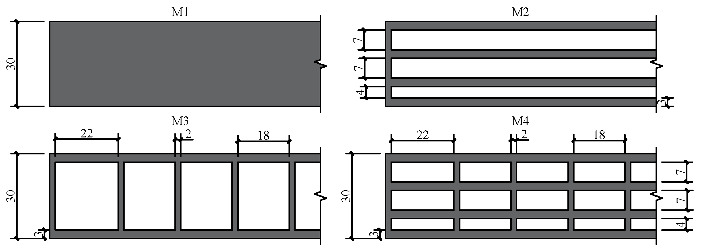 Figure 3. Illustrations of the M1, M2, M3, and M4 parapets, including their respective dimensions (in mm).