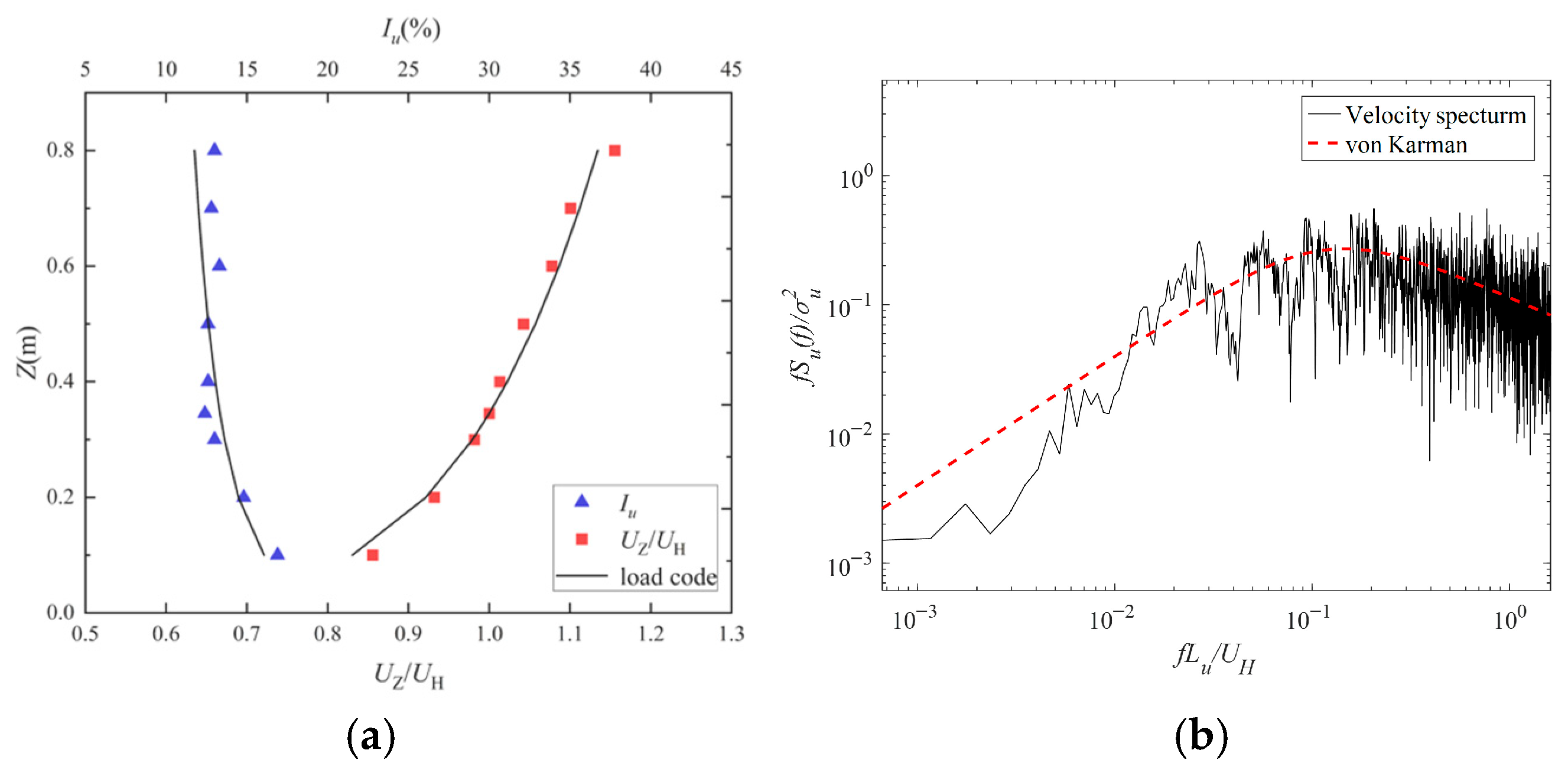 Figure 4. Characteristics of wind flow: (a) profiles of normalized mean wind speed and turbulence intensity; (b) power spectral density of turbulent wind speed in along-wind direction.