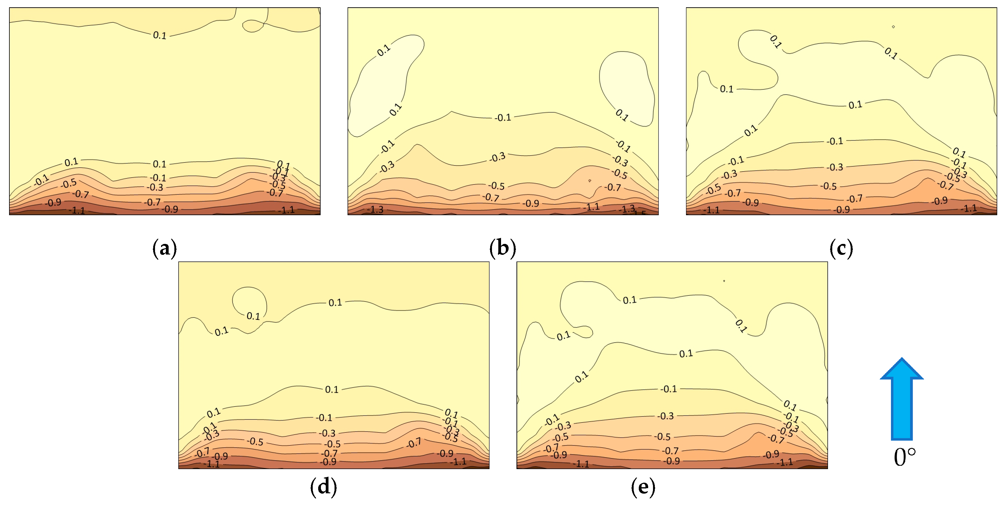 Figure 5 presents the distribution of net mean wind pressure on the overhead photovoltaic roof installed on a building rooftop under different parapet configurations at a wind direction angle of 0°. As shown in Figure 5a, the wind load on the overhead photovoltaic roof is predominantly negative. The incoming flow separates at the windward lower eave of the roof, and the separated shear layer rolls up to form columnar vortices. These vortices, with axes parallel to the windward edge, extend along the roof span and create a region of strong negative pressure. Among these, the negative mean pressure coefficient reaches its maximum value of −1.38 in the windward corner region. The contour lines of wind pressure distribution are approximately parallel to the windward low eave of the roof, and the negative mean wind pressure coefficient gradually decreases along the incoming wind direction. The maximum negative pressure at the windward corner is attributed to bidirectional flow separation; the airflow separates simultaneously along both the long and short edges of the photovoltaic panel, and the coupling of these two separation zones significantly increases the negative pressure magnitude. Notably, the study by Jiang et al. indicated that under a 0° incoming flow, an open canopy installed on a building also experiences airflow separation at the windward leading edge, forming columnar vortices and generating maximum negative pressure at the windward corner. This conclusion is highly consistent with the experimental results of this study.