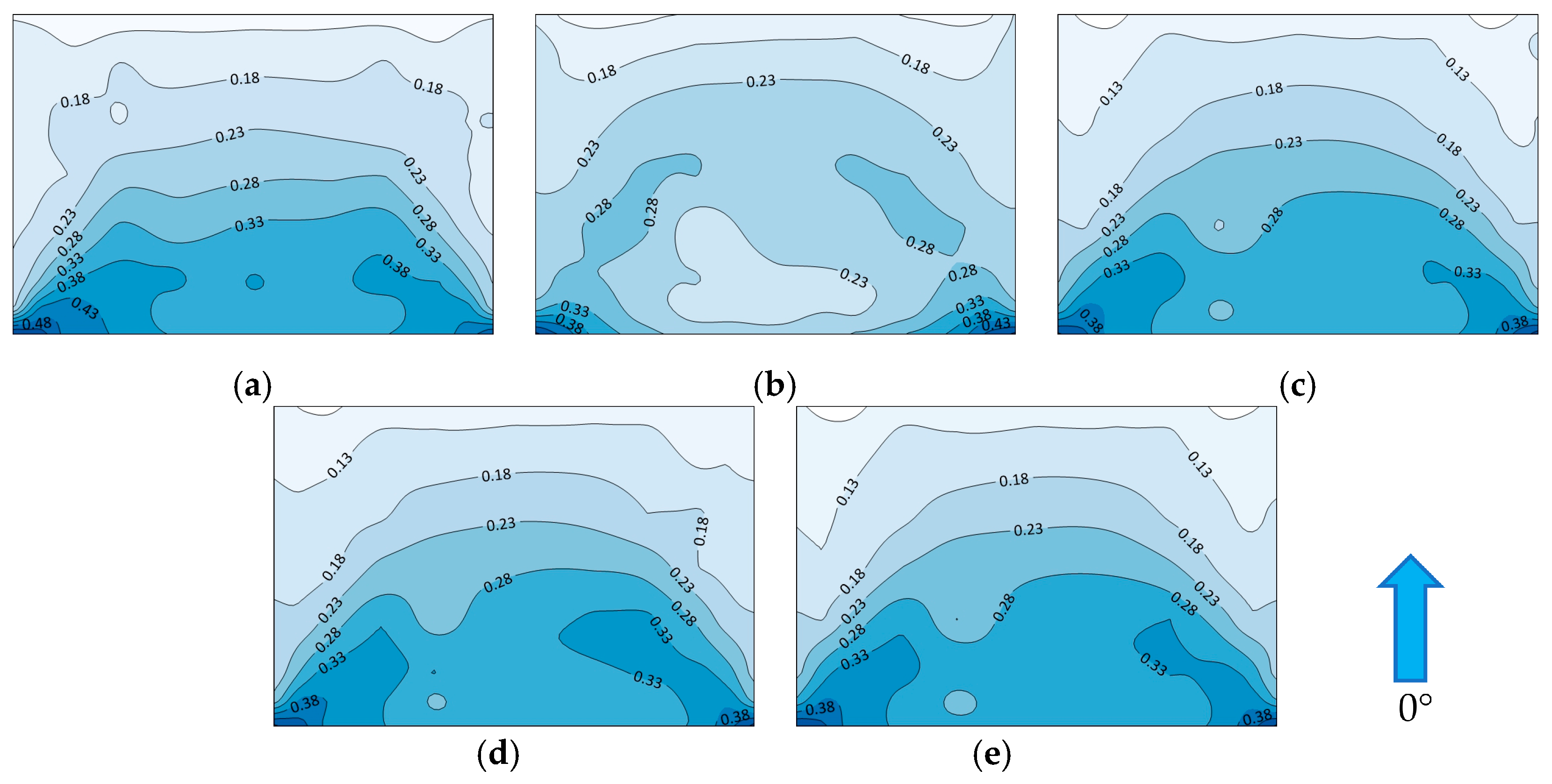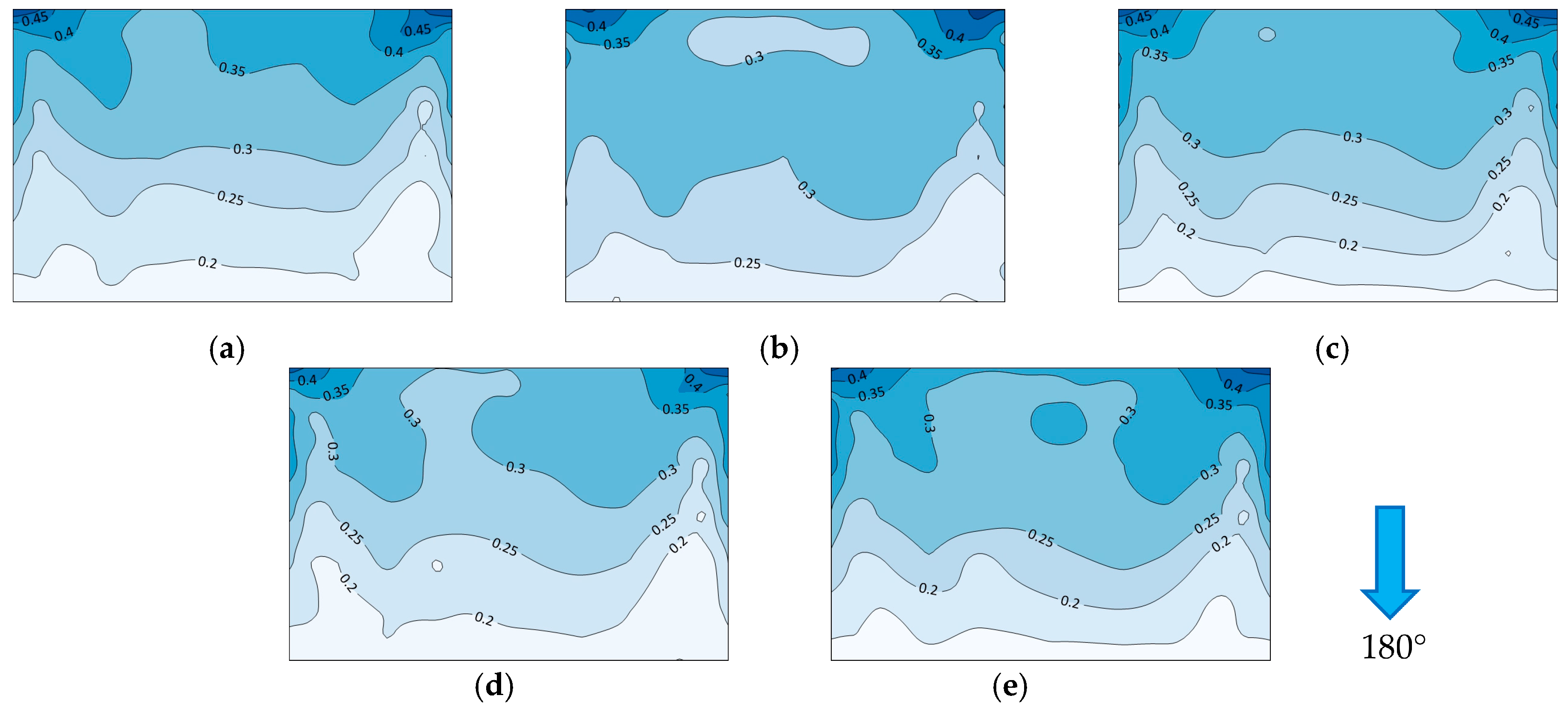 Figure 12. Distribution of fluctuating wind pressure coefficients of various parapets at 180° wind angle: (a) no parapet Ref; (b) solid parapet M1; (c) horizontal parapet M2; (d) vertical parapet M3; (e) rectangular grid parapet M4 (the deeper the blue, the larger the positive value).