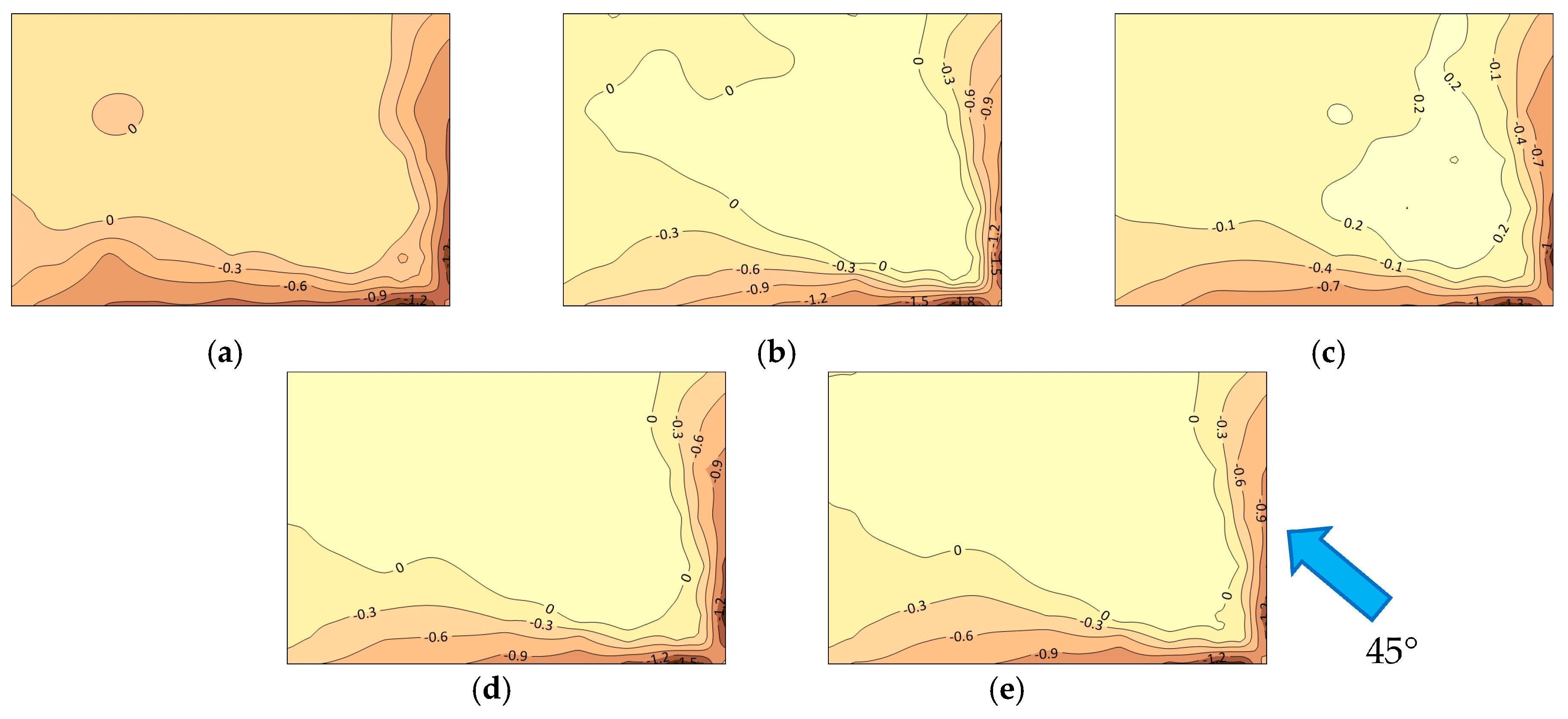Figure 7. Distribution of mean wind pressure coefficients of various parapets at 45° wind angle: (a) without a parapet Ref; (b) solid parapet M1; (c) horizontal parapet M2; (d) vertical parapet M3; (e) rectangular grid parapet M4 (the closer the color is to brown, the larger the magnitude of the negative wind pressure coefficient).