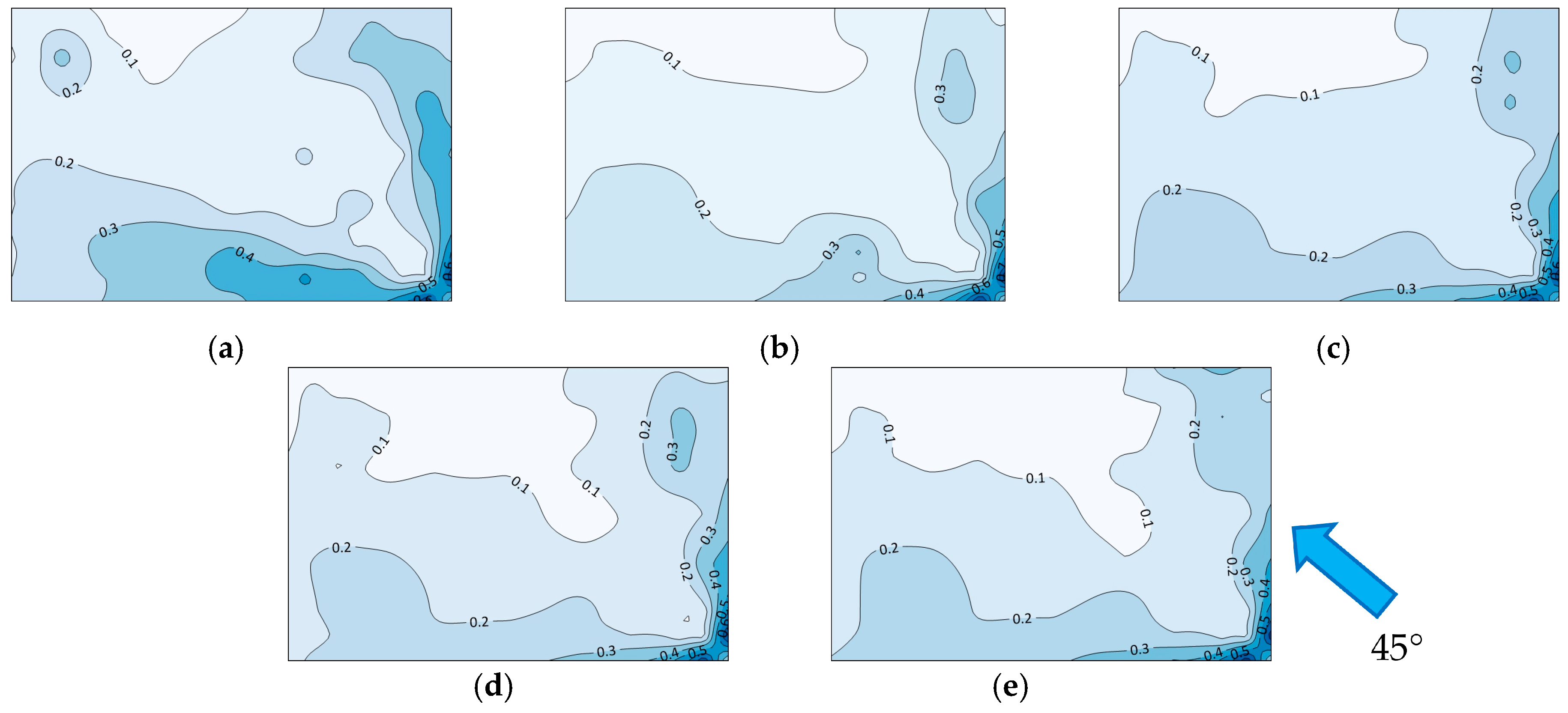 Figure 8. Distribution of fluctuating wind pressure coefficients of various parapets at 45° wind angle: (a) no parapet Ref; (b) solid parapet M1; (c) horizontal parapet M2; (d) vertical parapet M3; (e) rectangular grid parapet M4 (the deeper the blue, the larger the positive value).